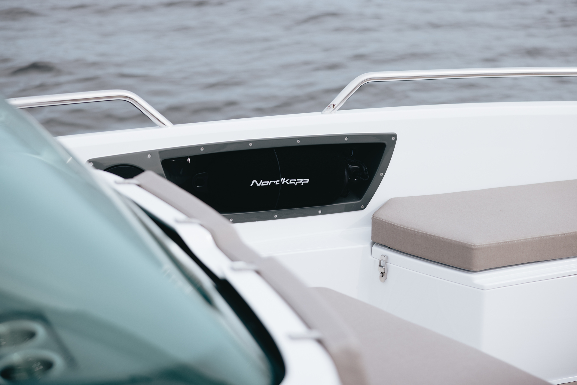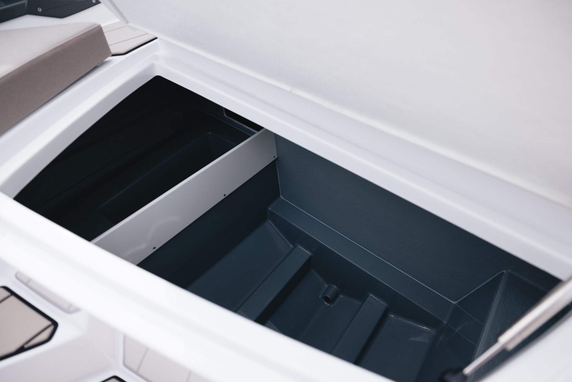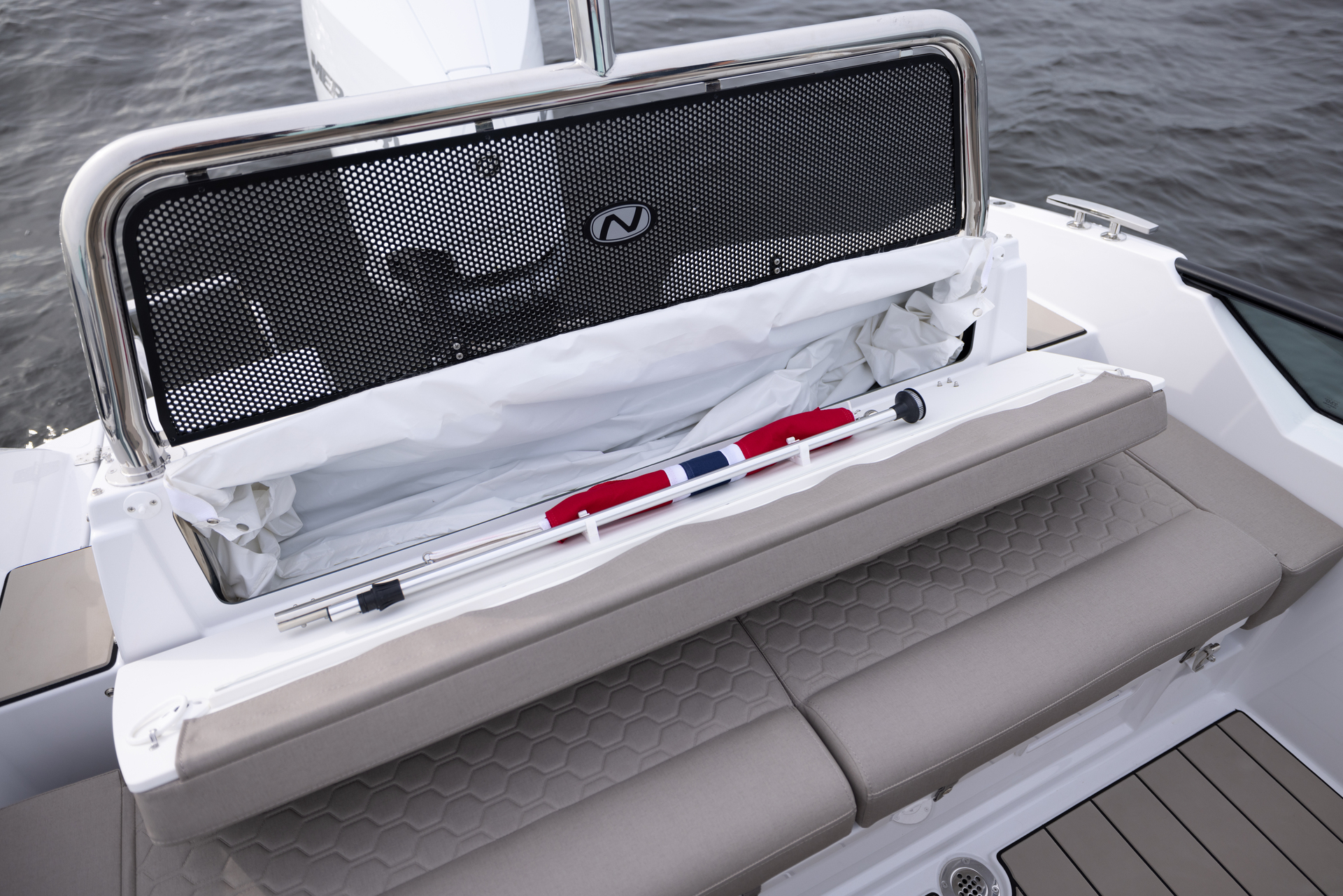 Hidden storage garage under the console holds a retractable canopy to protect from sun or spray when needed