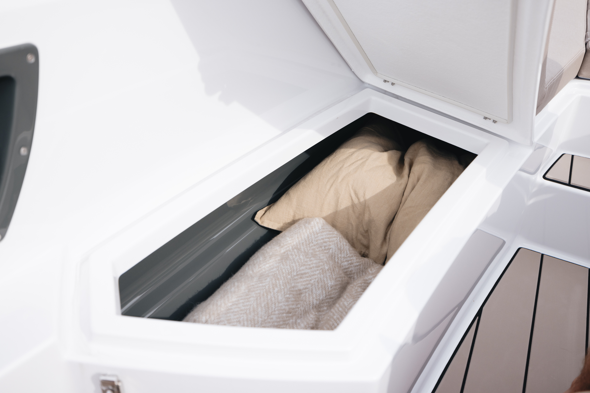 Bow deck transforms quickly into a spacious sun lounging area with optional infill cushion