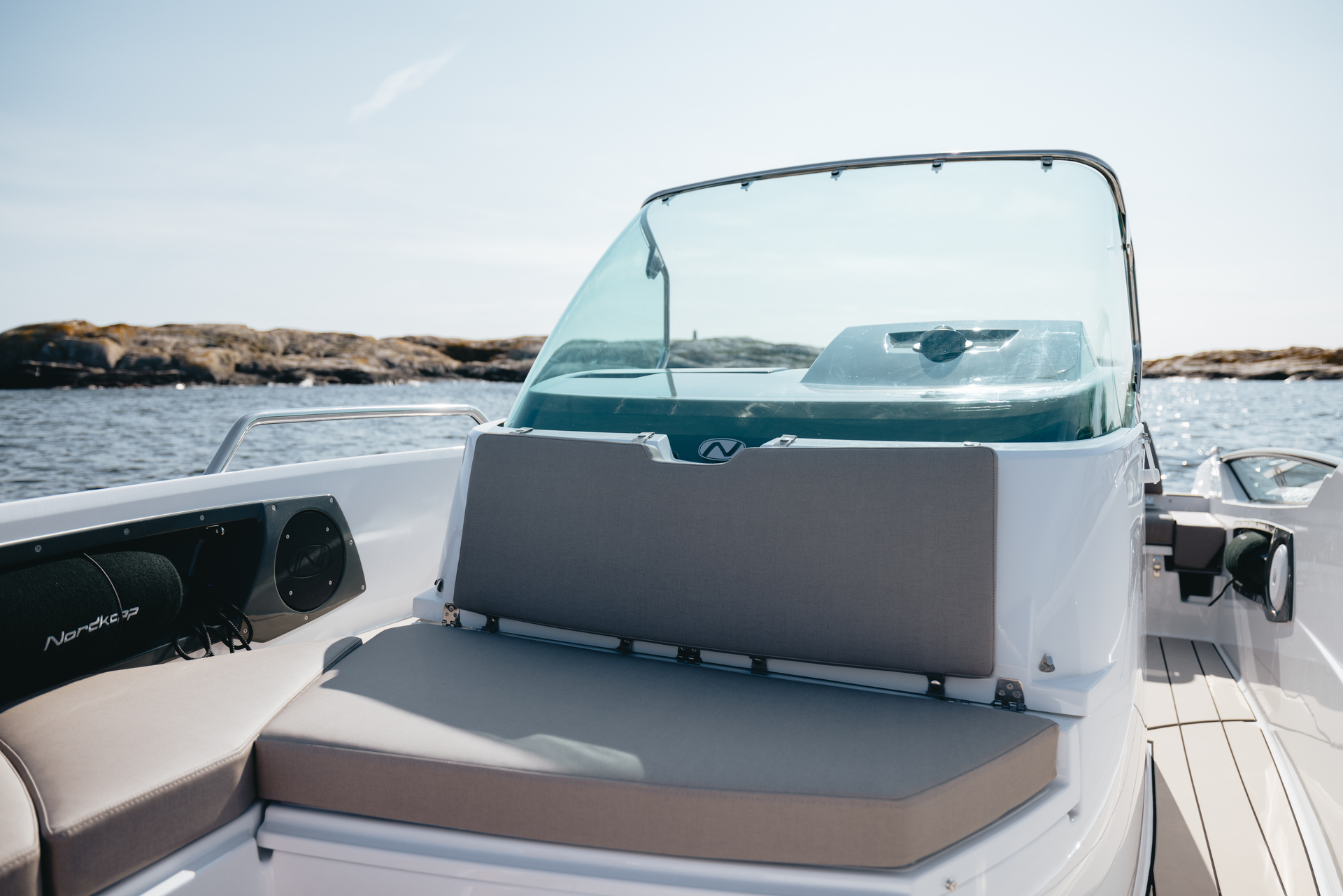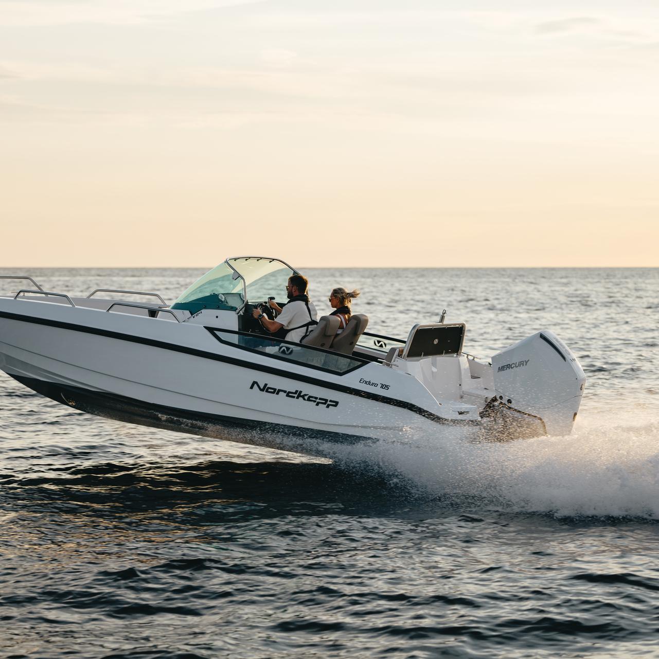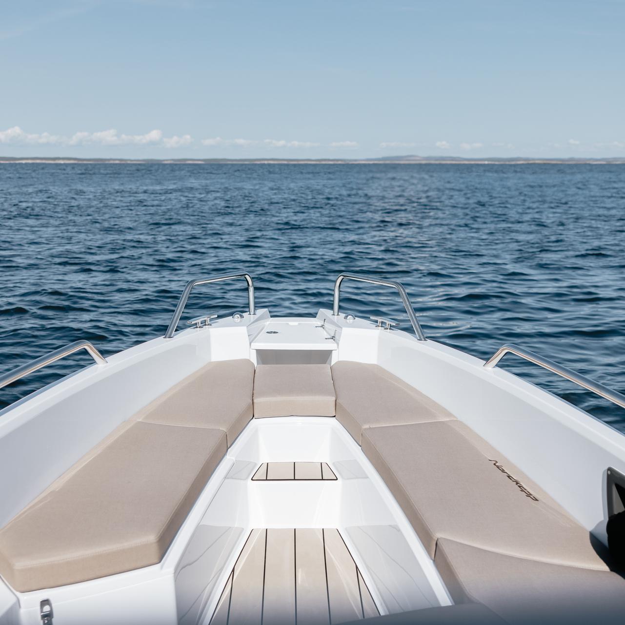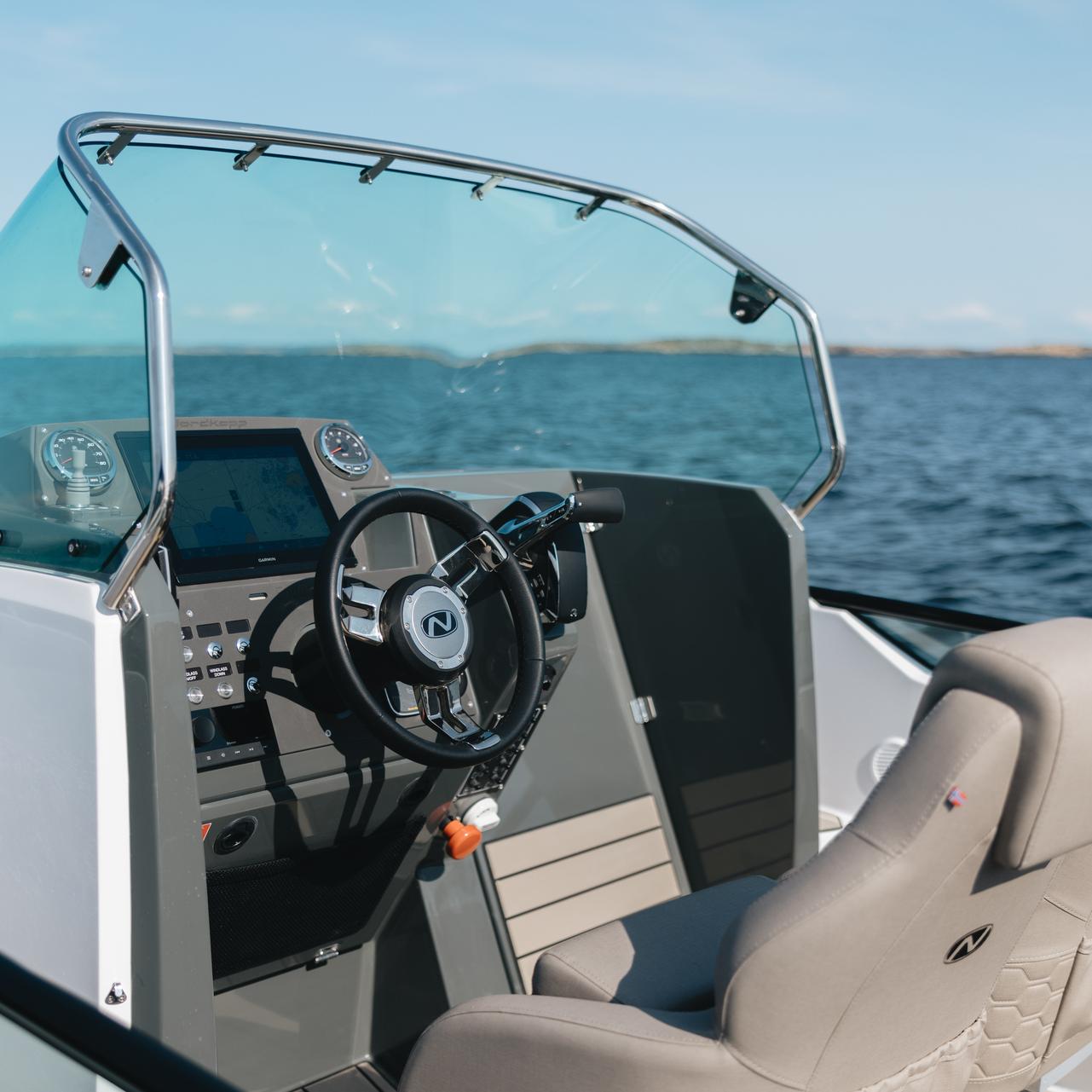 Solid GRP construction with premium fittings, hydraulic steering and ergonomic helm reflect Nordkapp’s craftsmanship.