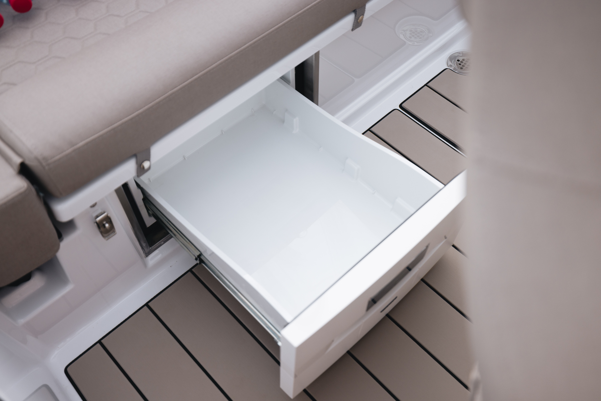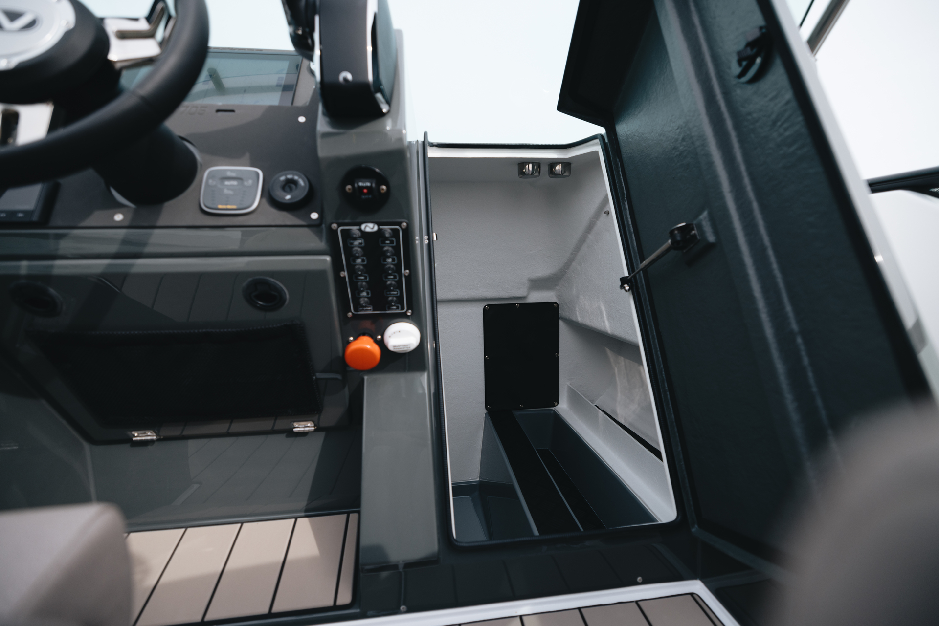 Bow lockers, console compartments and stern bins keep gear secure and dry throughout the vessel