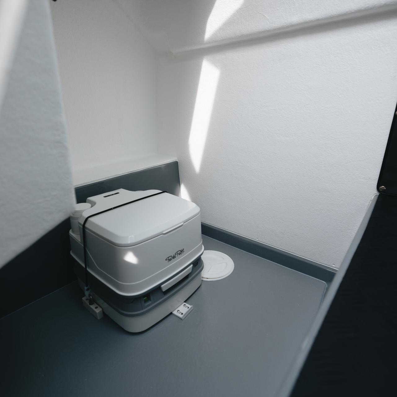 Compact interior console includes a chemical toilet and dedicated compartment—ideal for day trips or overnight stays