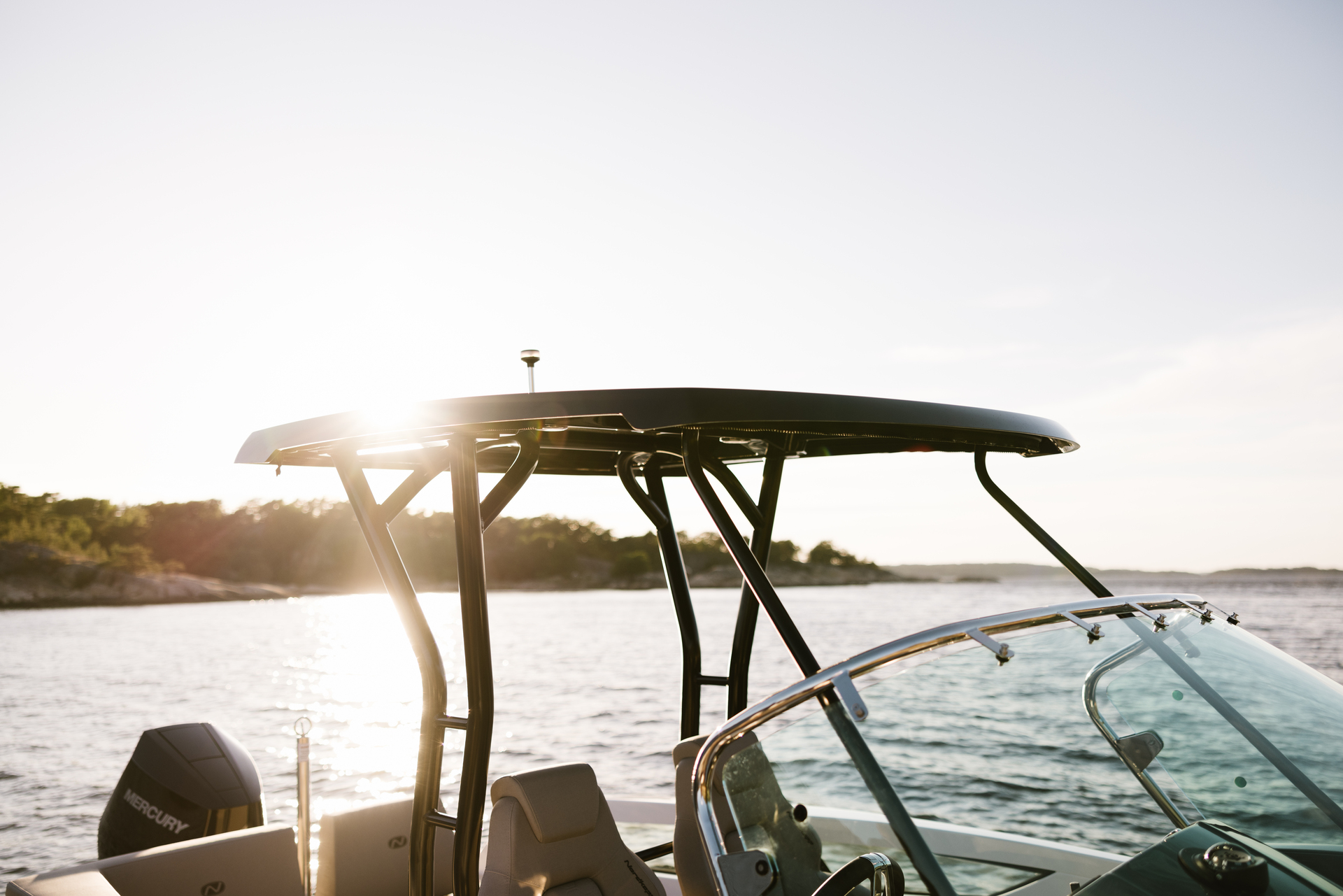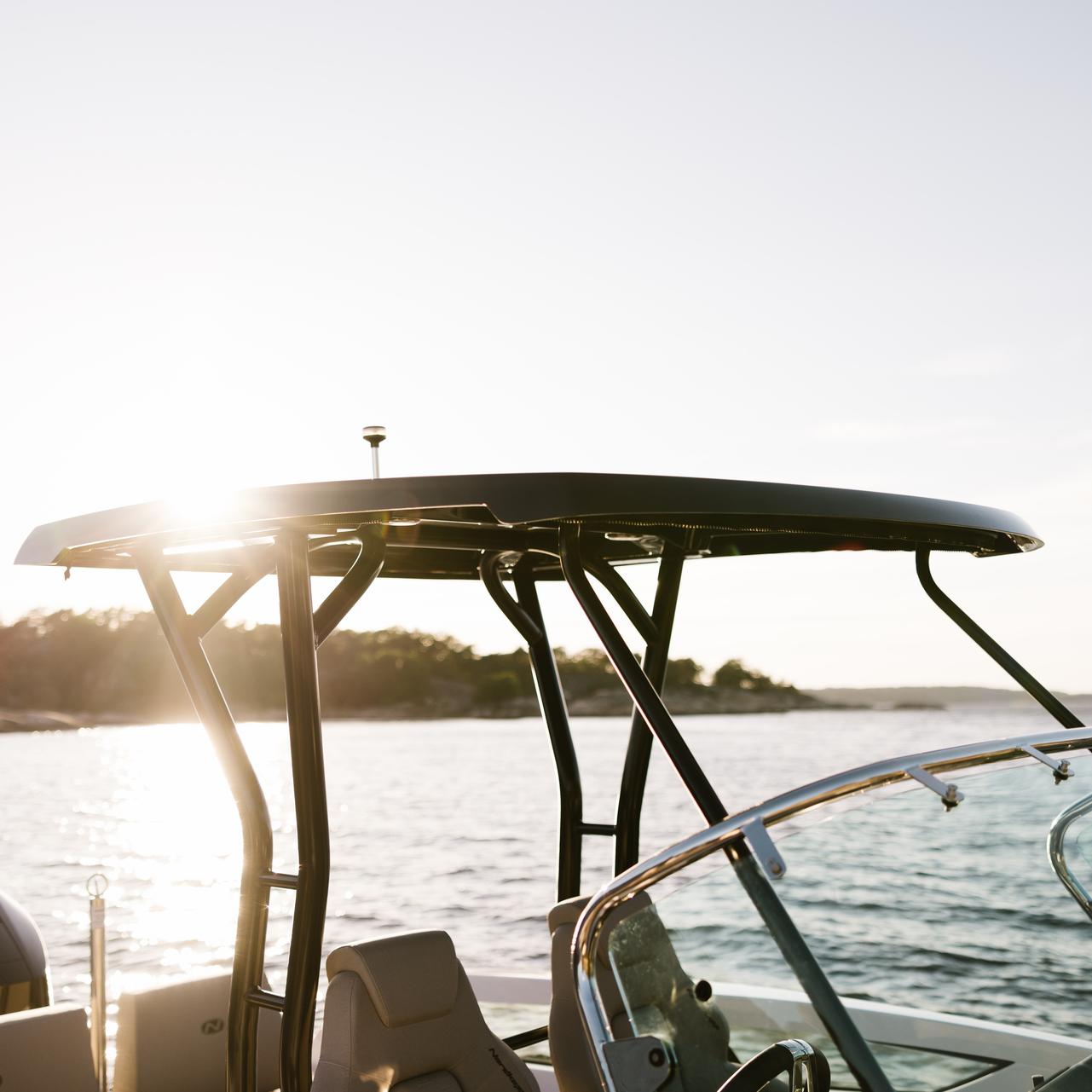 Sturdy T‑Top shelter provides shade and architectural style while preserving full movement around the helm