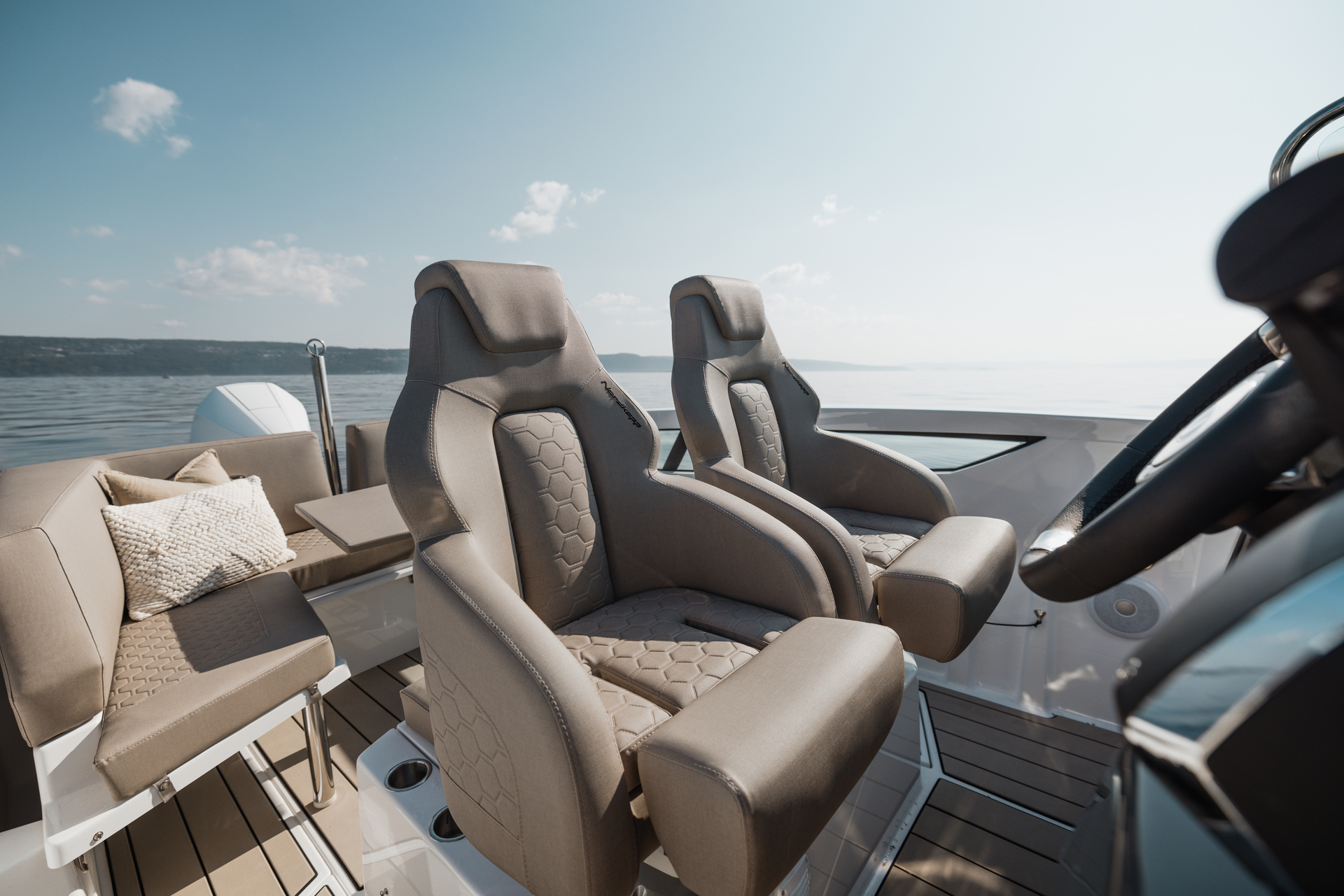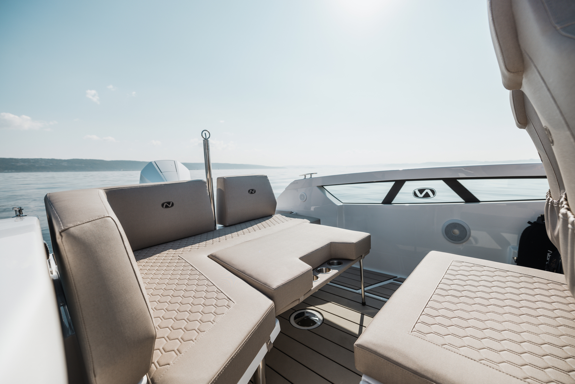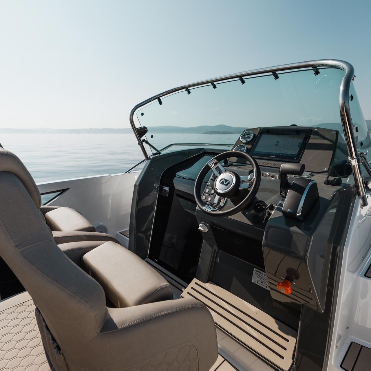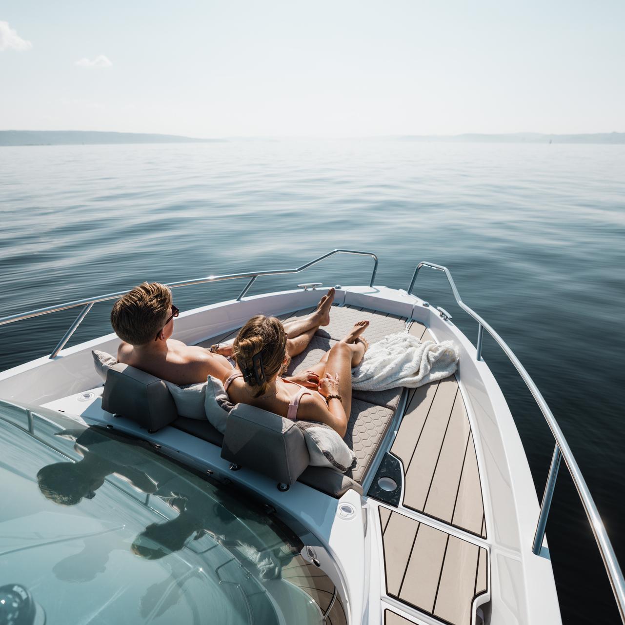 Stylish minimalism, premium materials, hydraulic steering, S‑Deck flooring and durable GRP hull reflect thoughtful craftsmanship