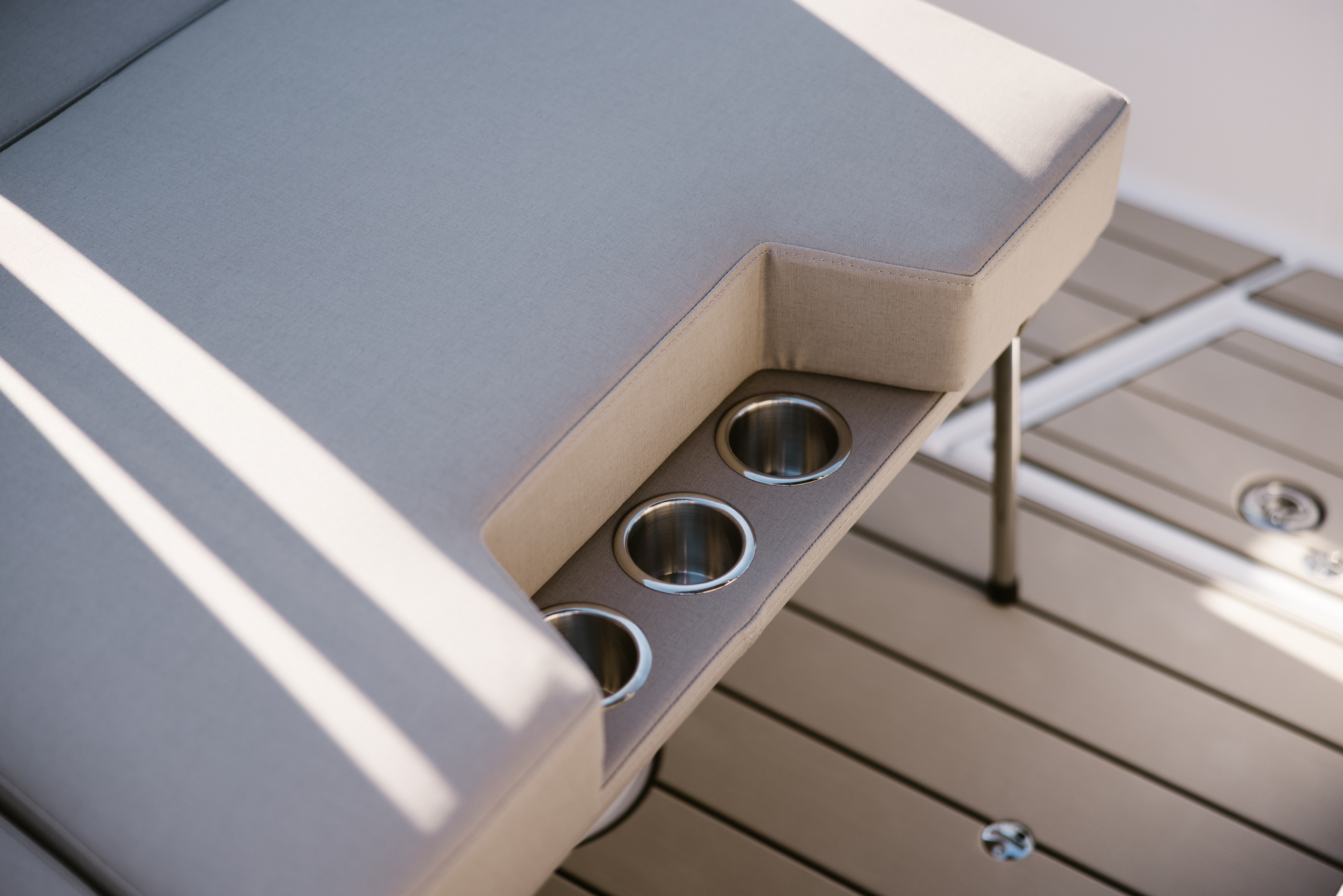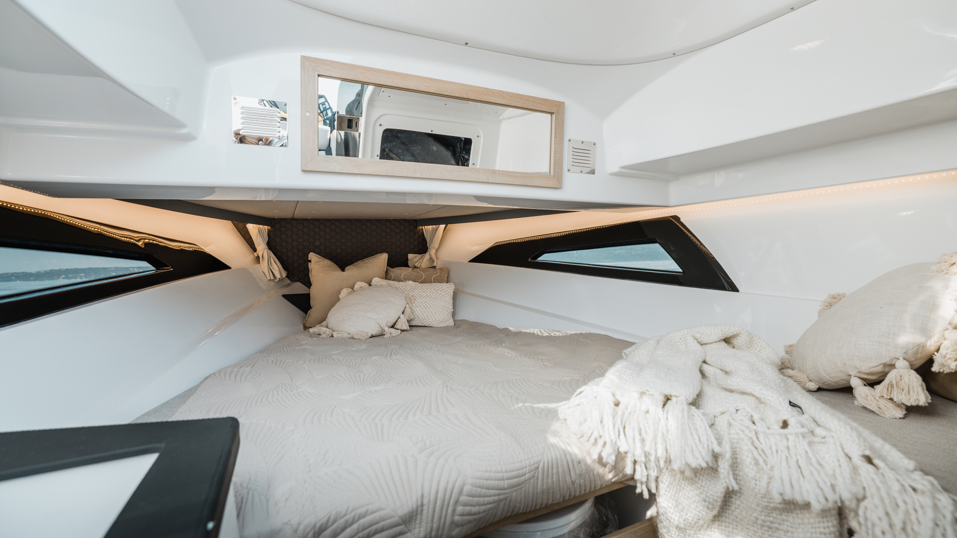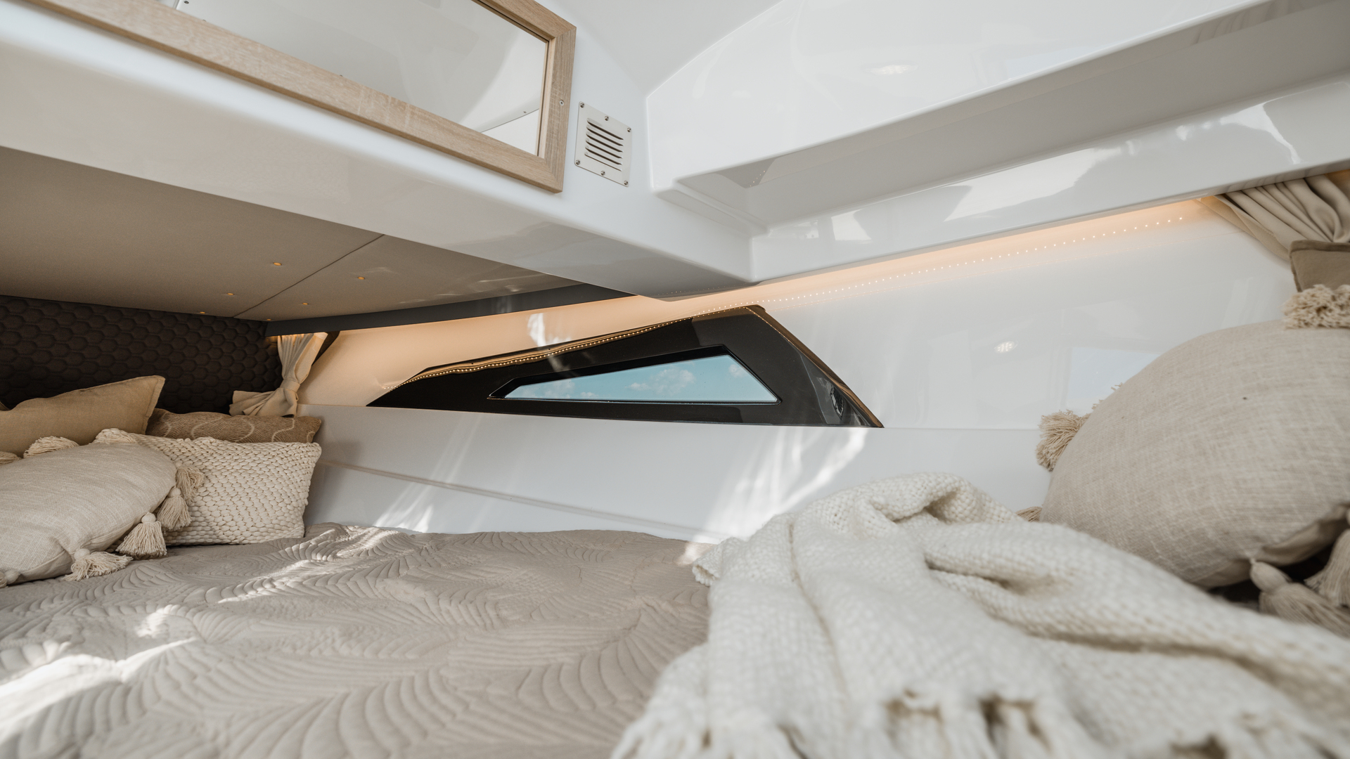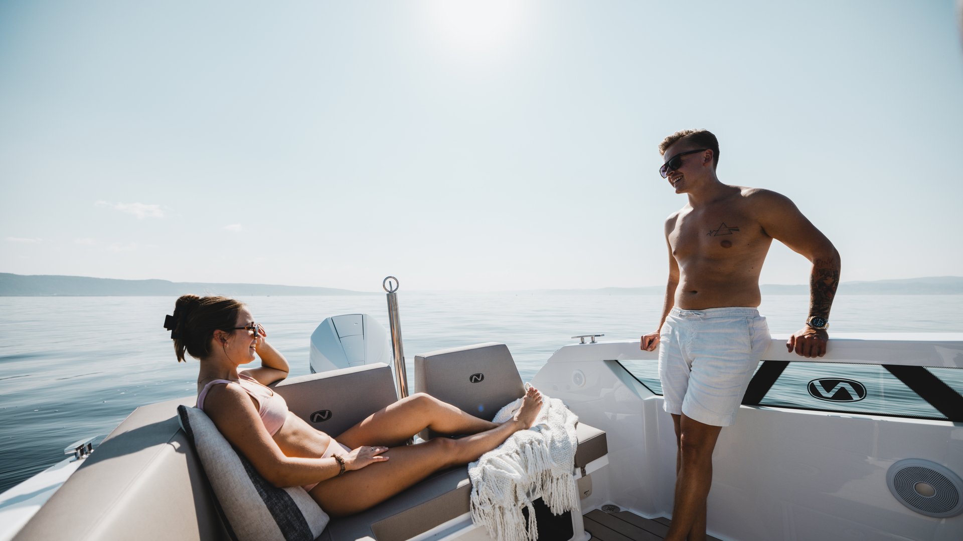Stylish minimalism, premium materials, hydraulic steering, S‑Deck flooring and durable GRP hull reflect thoughtful craftsmanship