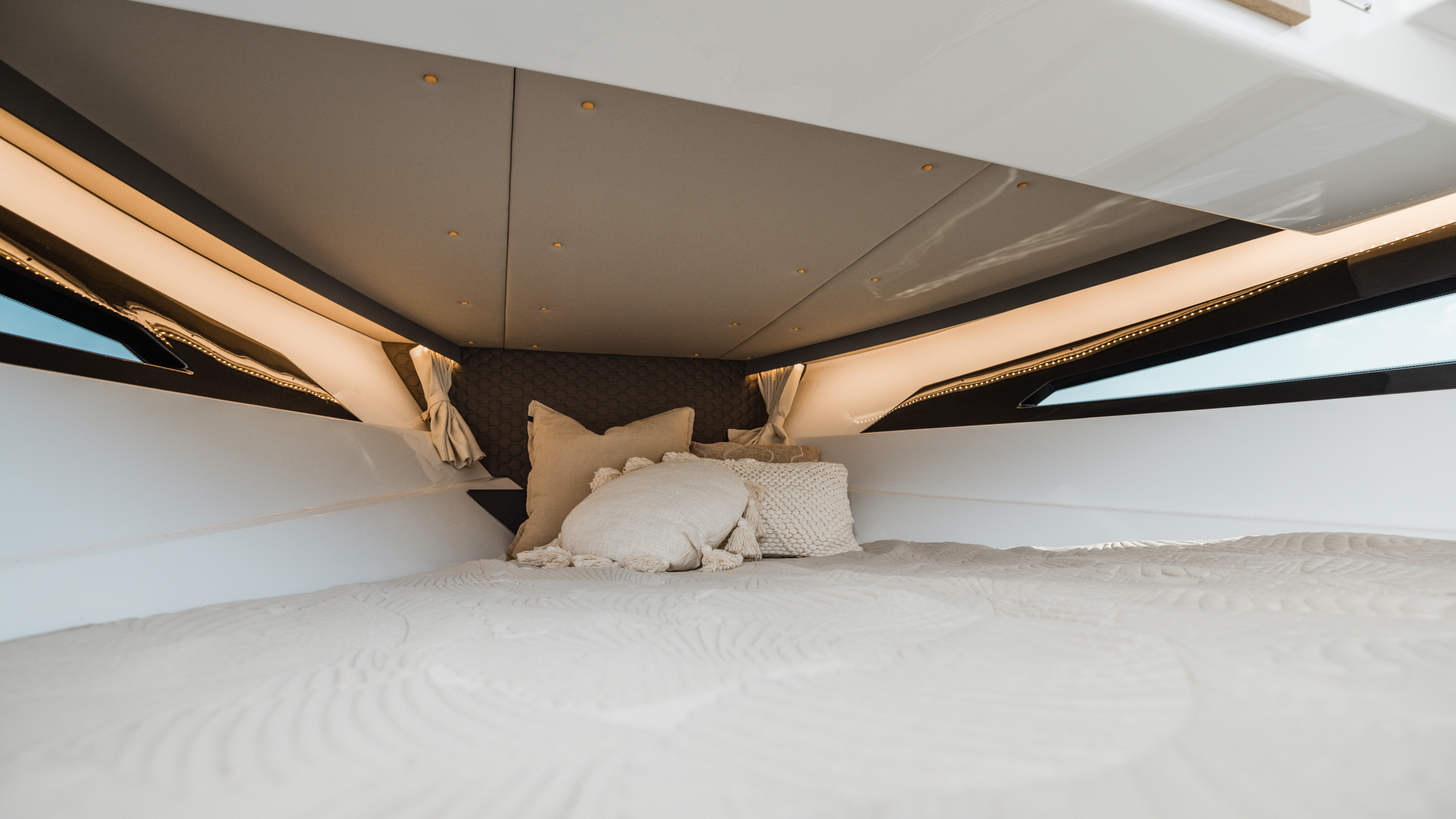 Generous sunbeds at bow and stern convert from seating to lounging zones—ideal for soaking up rays or napping aboard.