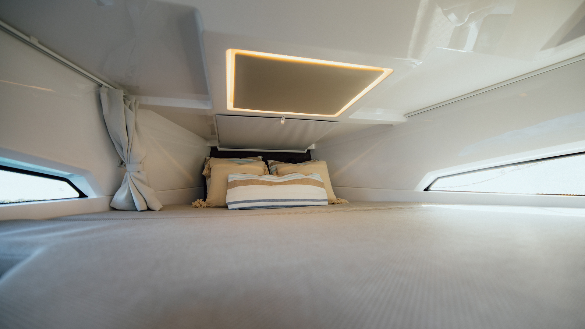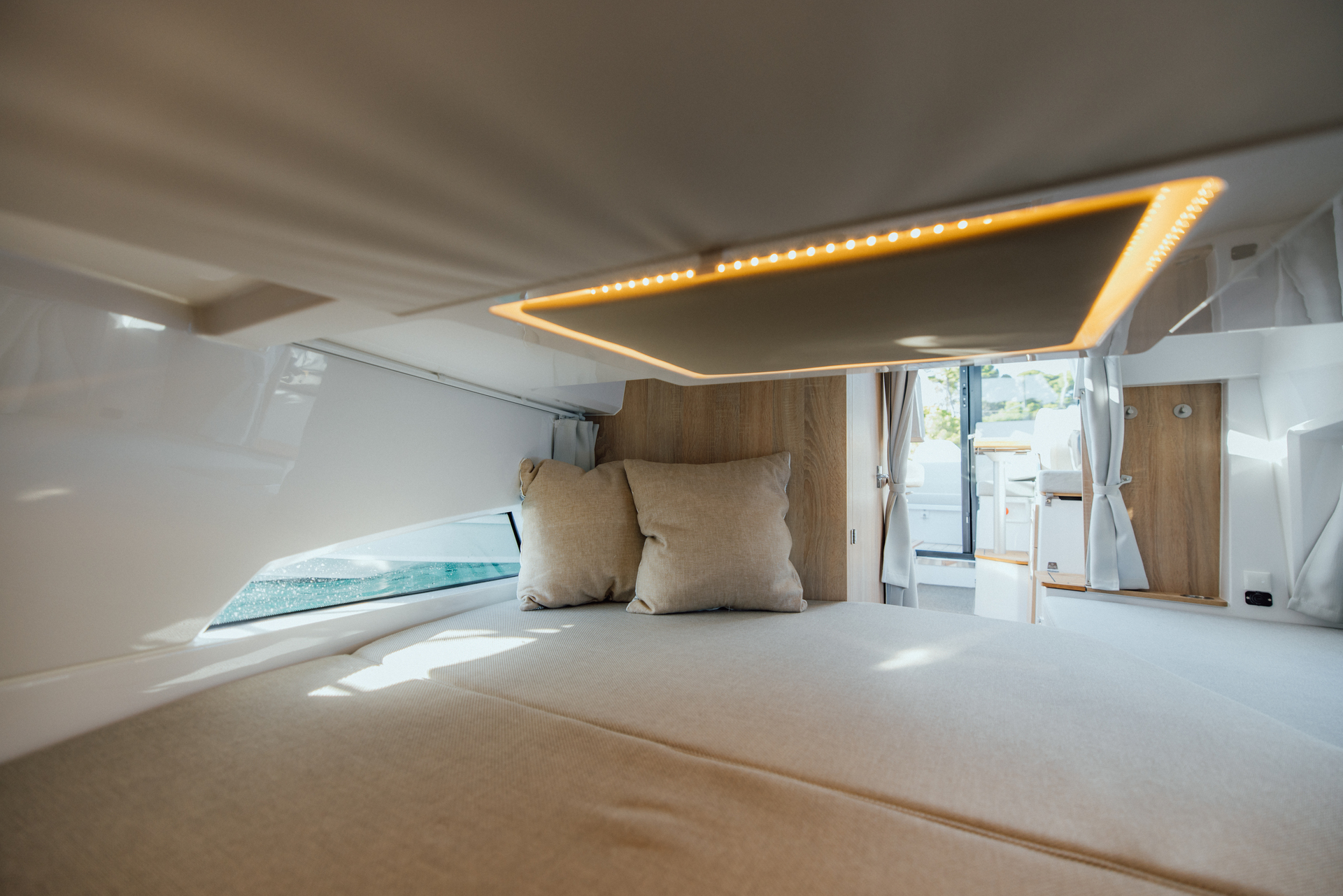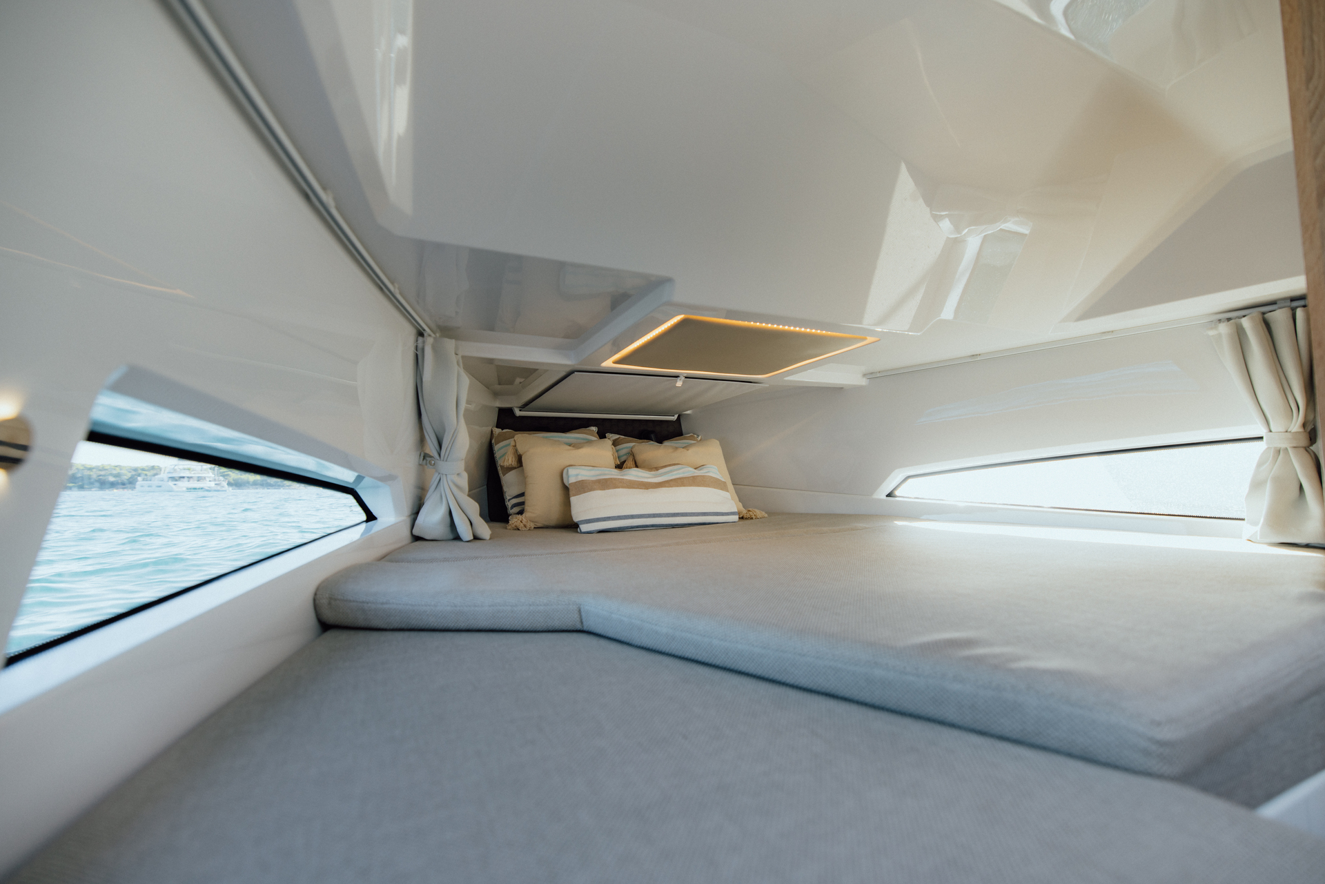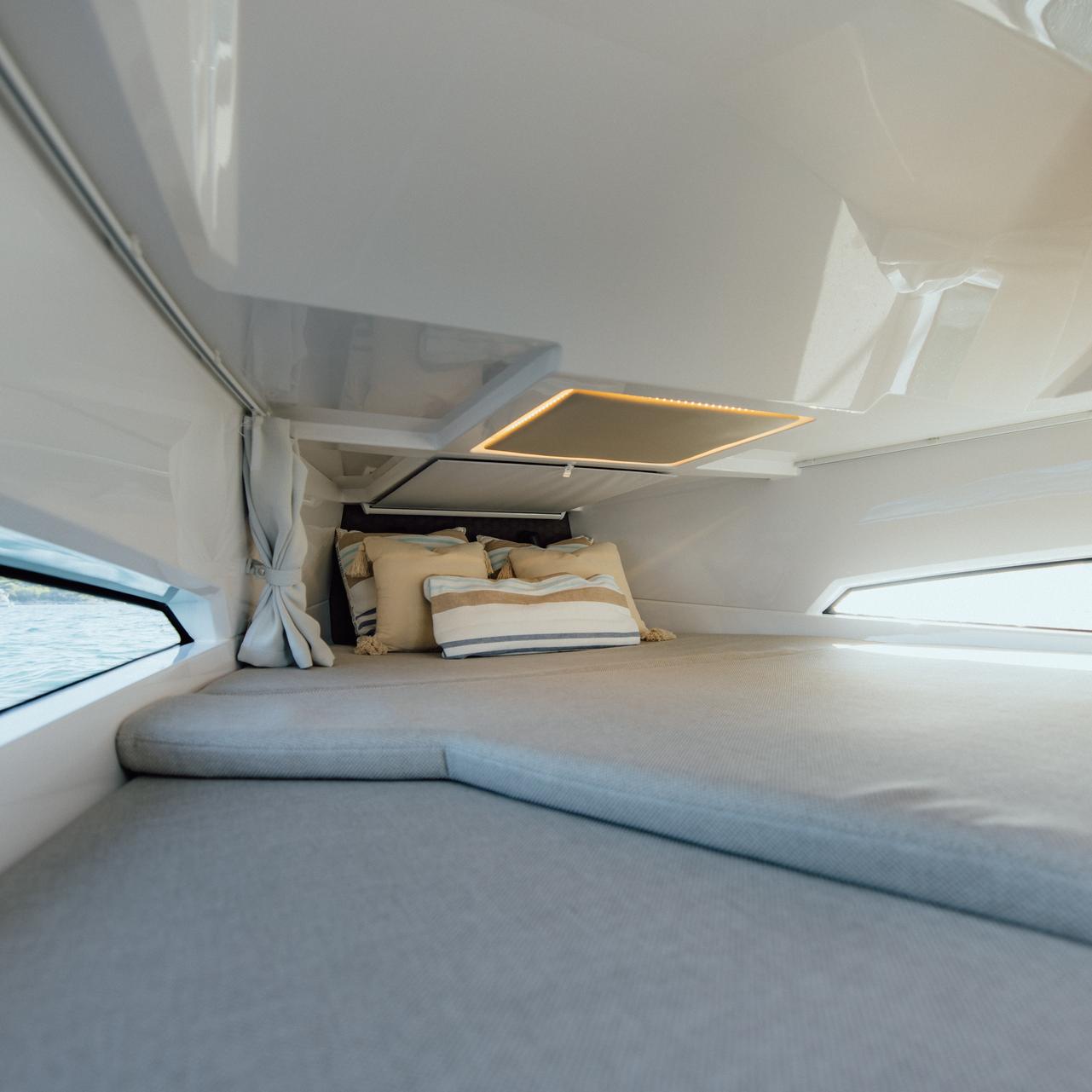 Forward cabin features a true double berth, ambient lighting, hull windows, and seating-dinette that converts into additional sleeping space for up to five aboard