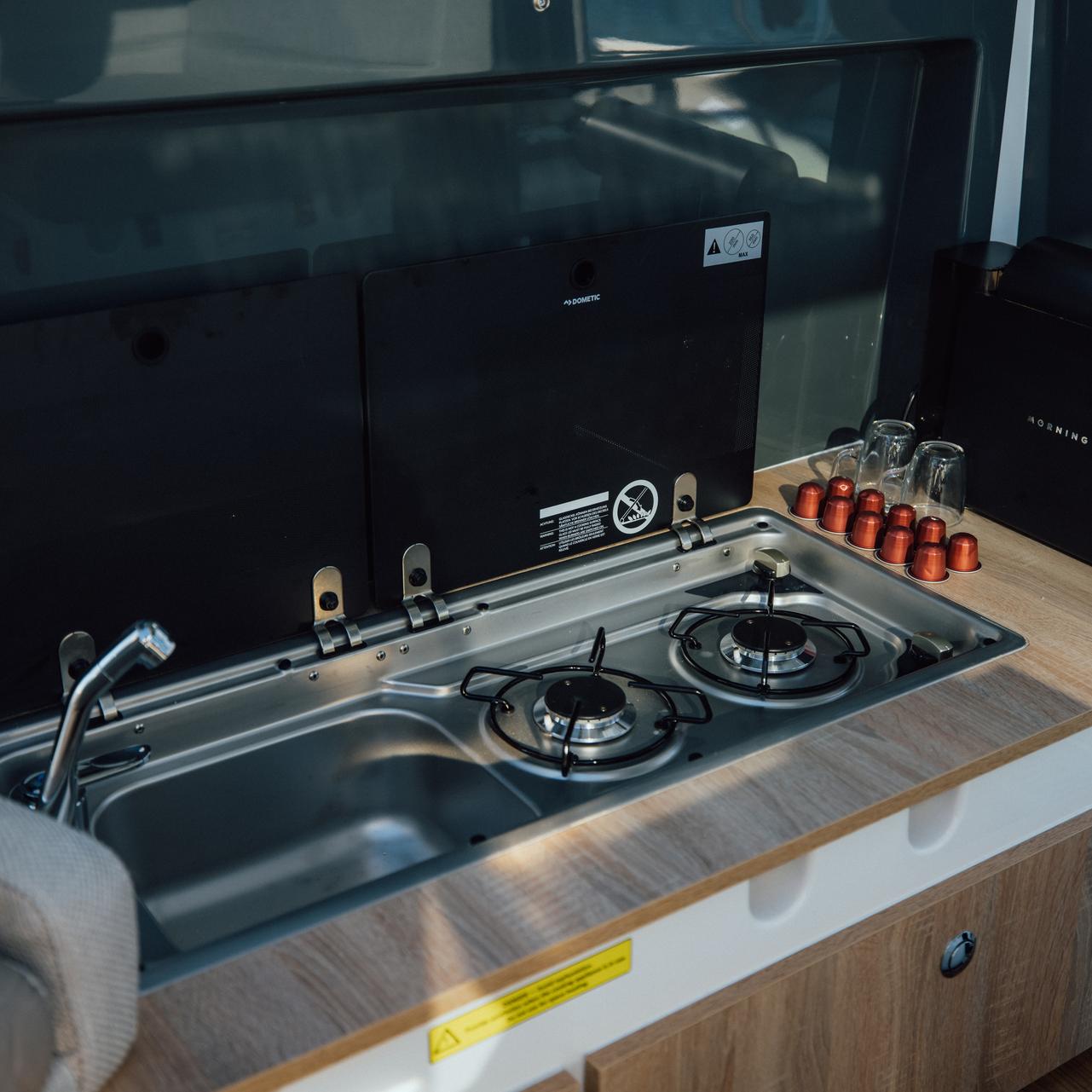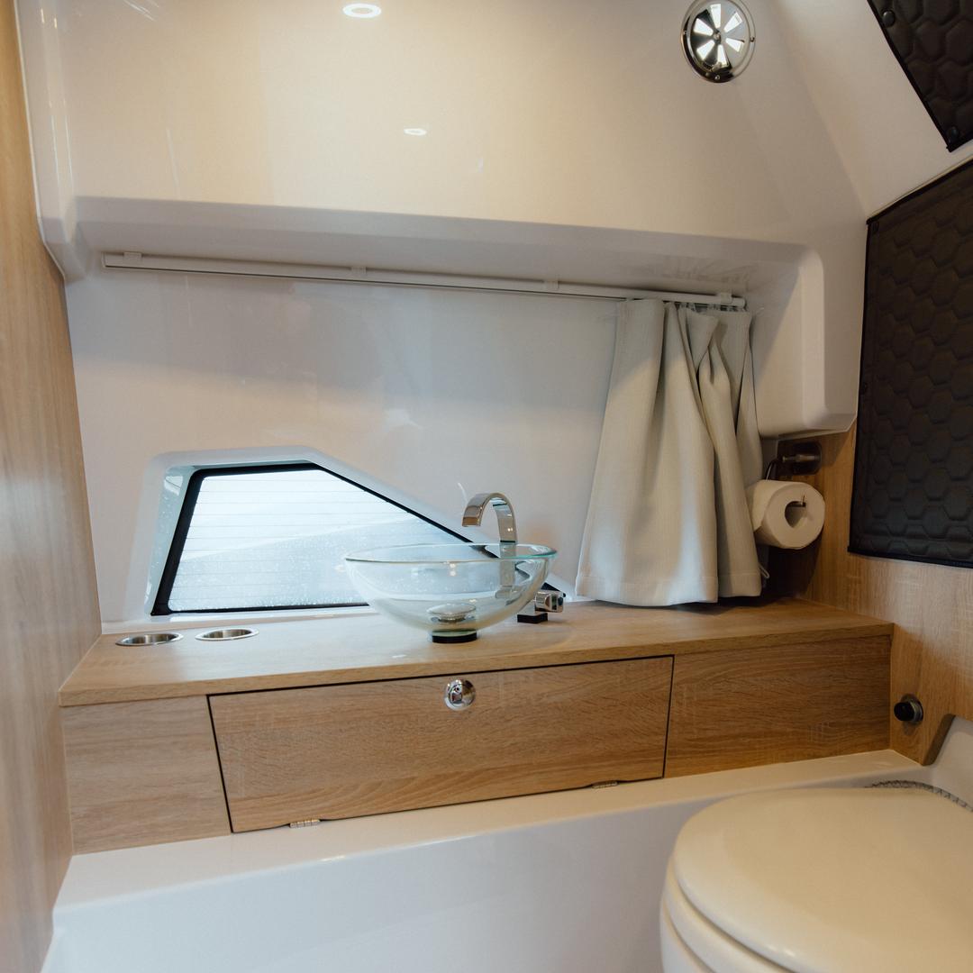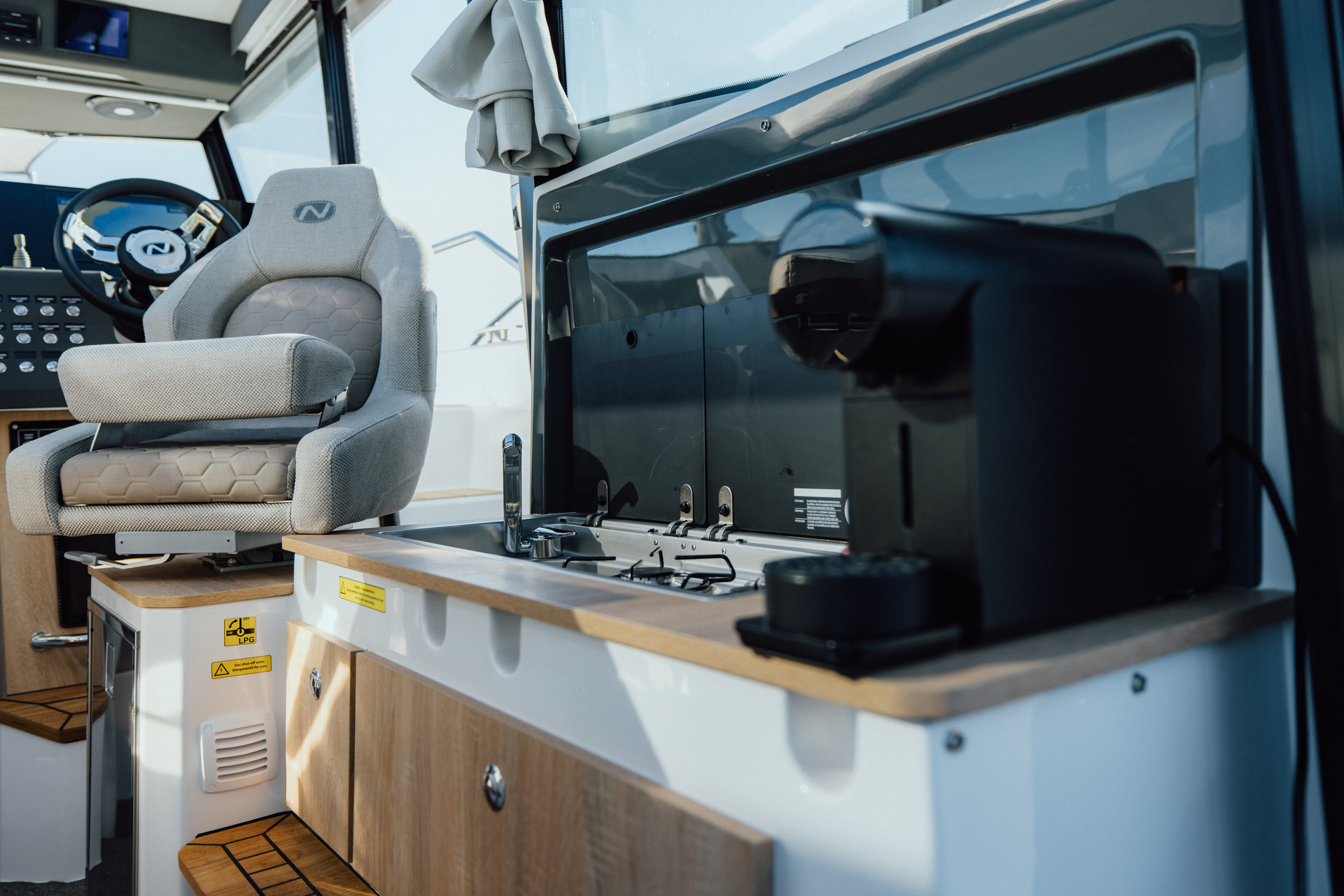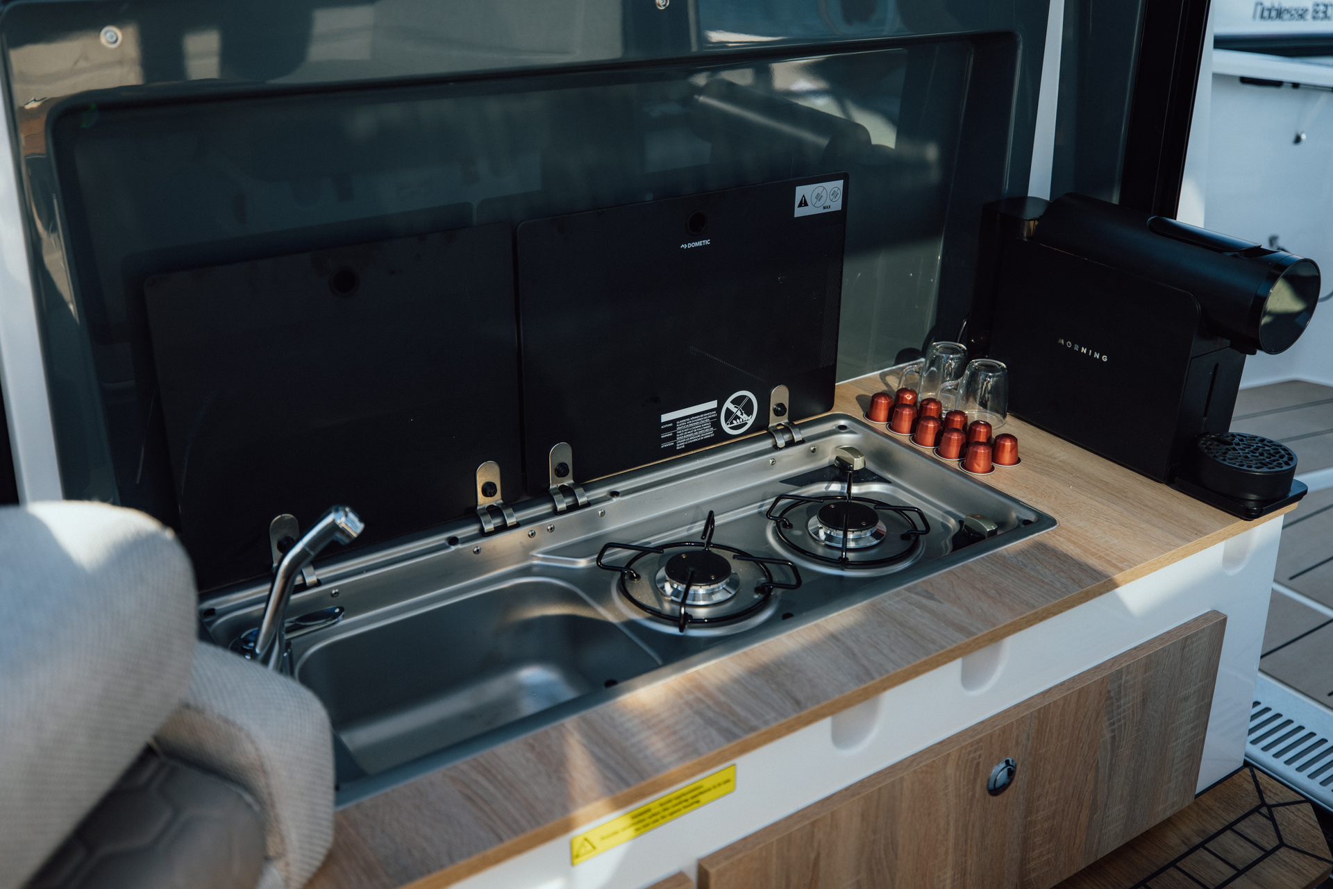 Onboard galley with sink, fridge drawer, worktop, and glassware storage makes light meal prep and refreshments effortless—even during extended cruises
