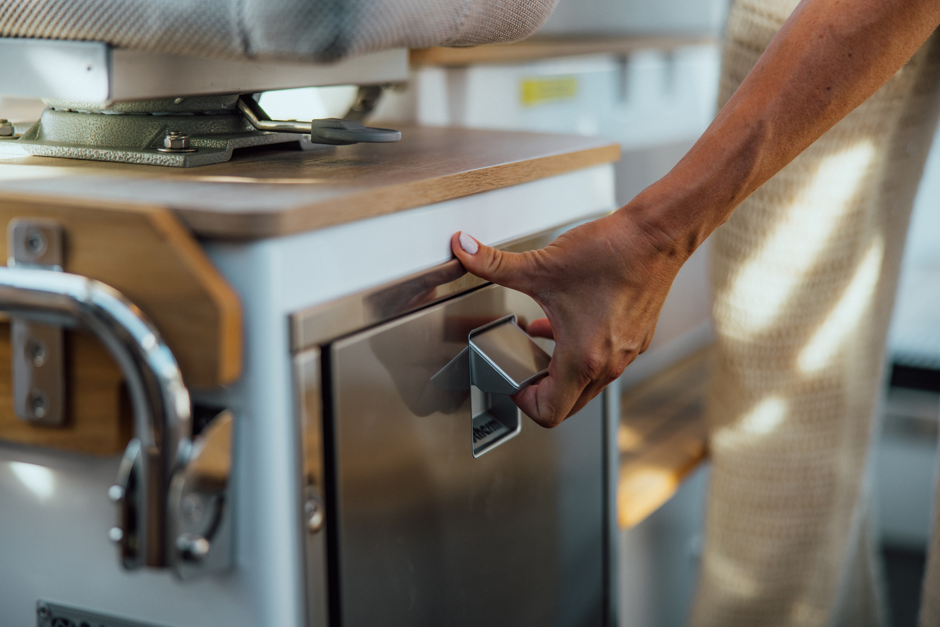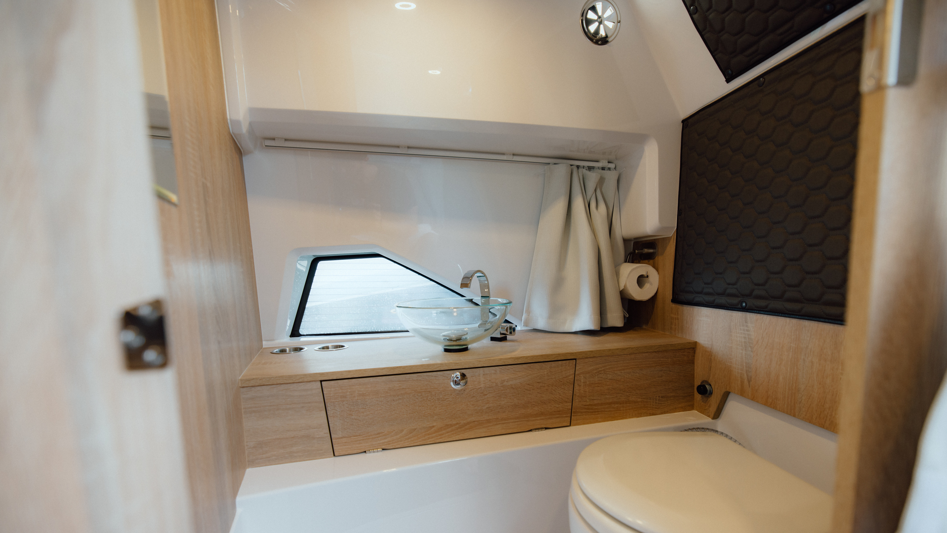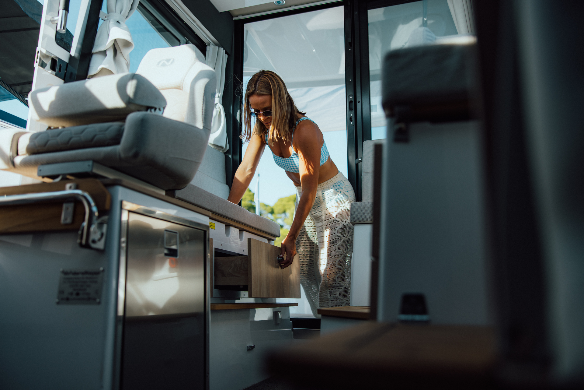 Onboard galley with sink, fridge drawer, worktop, and glassware storage makes light meal prep and refreshments effortless—even during extended cruises