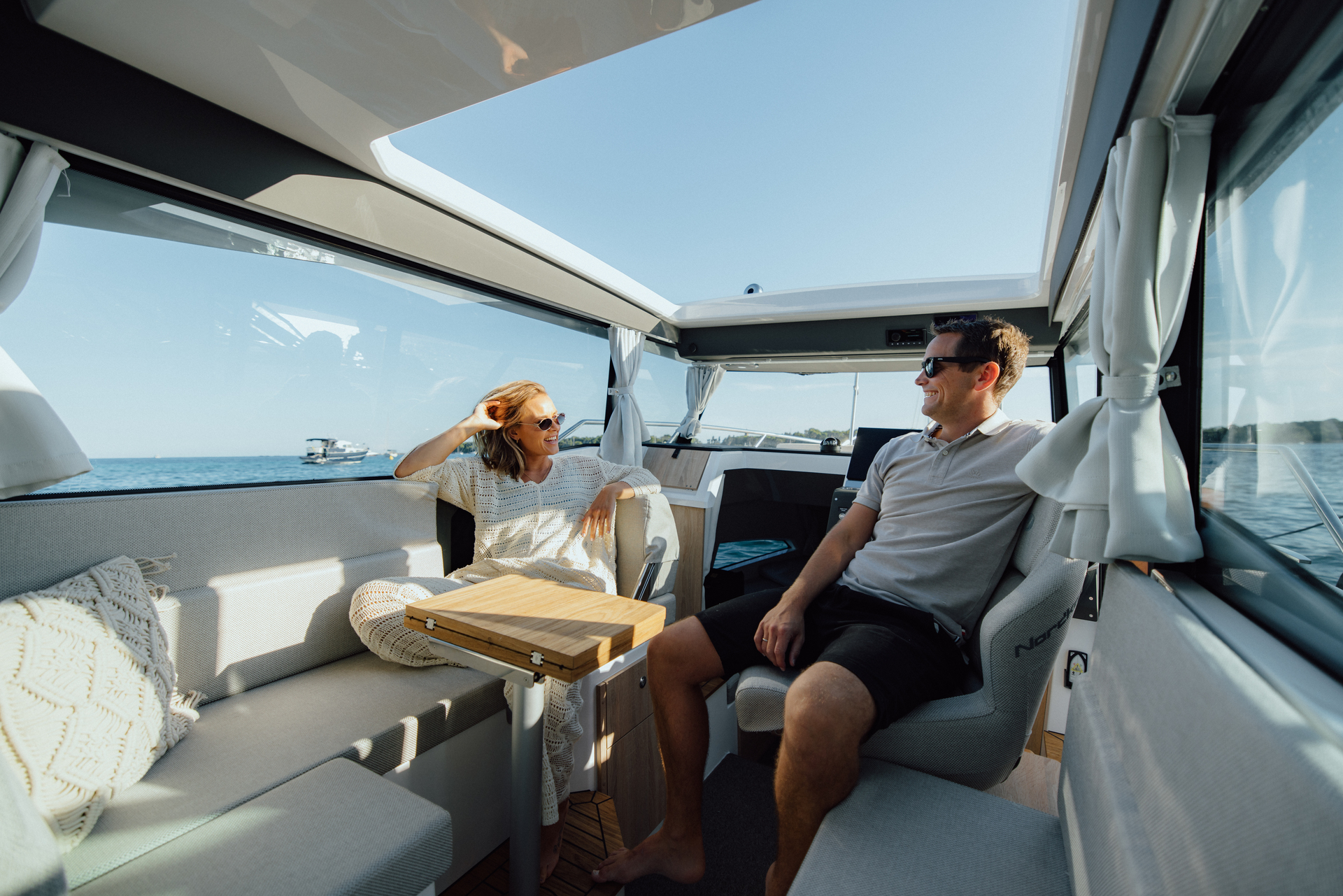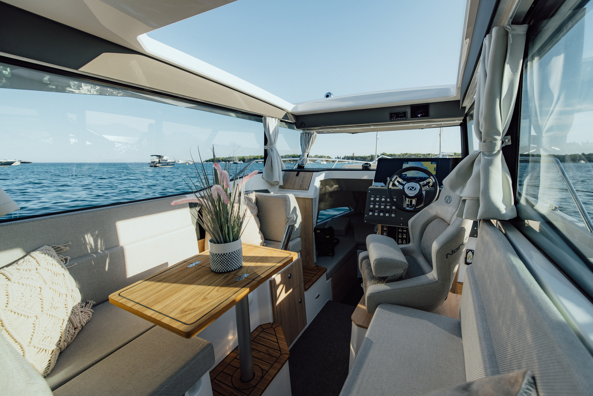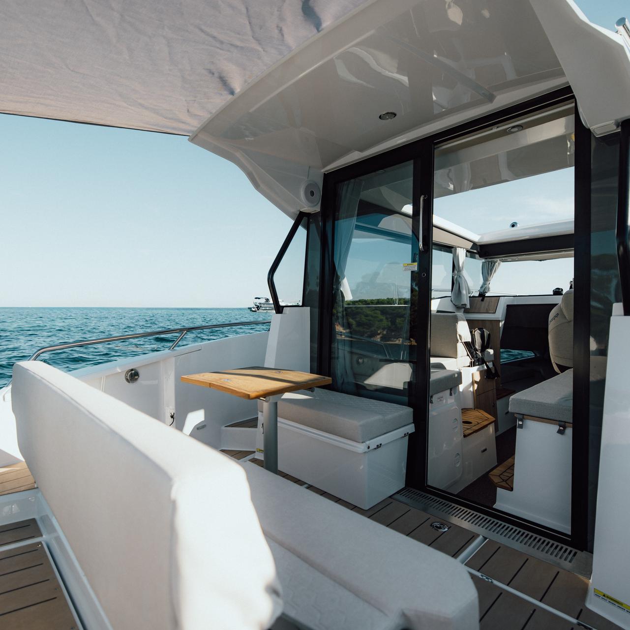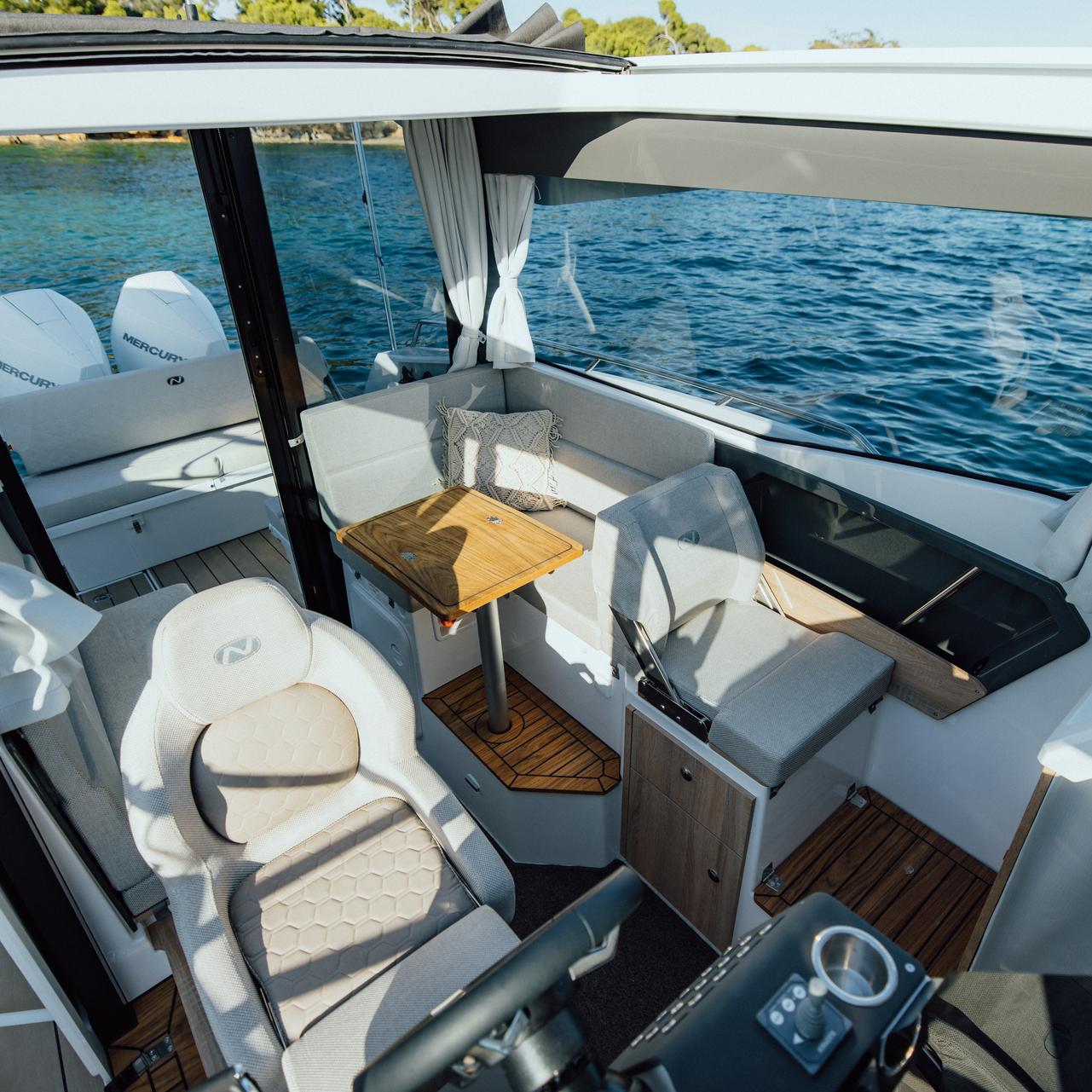 Premium materials—tempered-glass windscreen, stainless fittings, S‑Deck soft floor, refined joinery, hydraulic steering—and Scandinavian craftsmanship provide durability, comfort, and timeless elegance