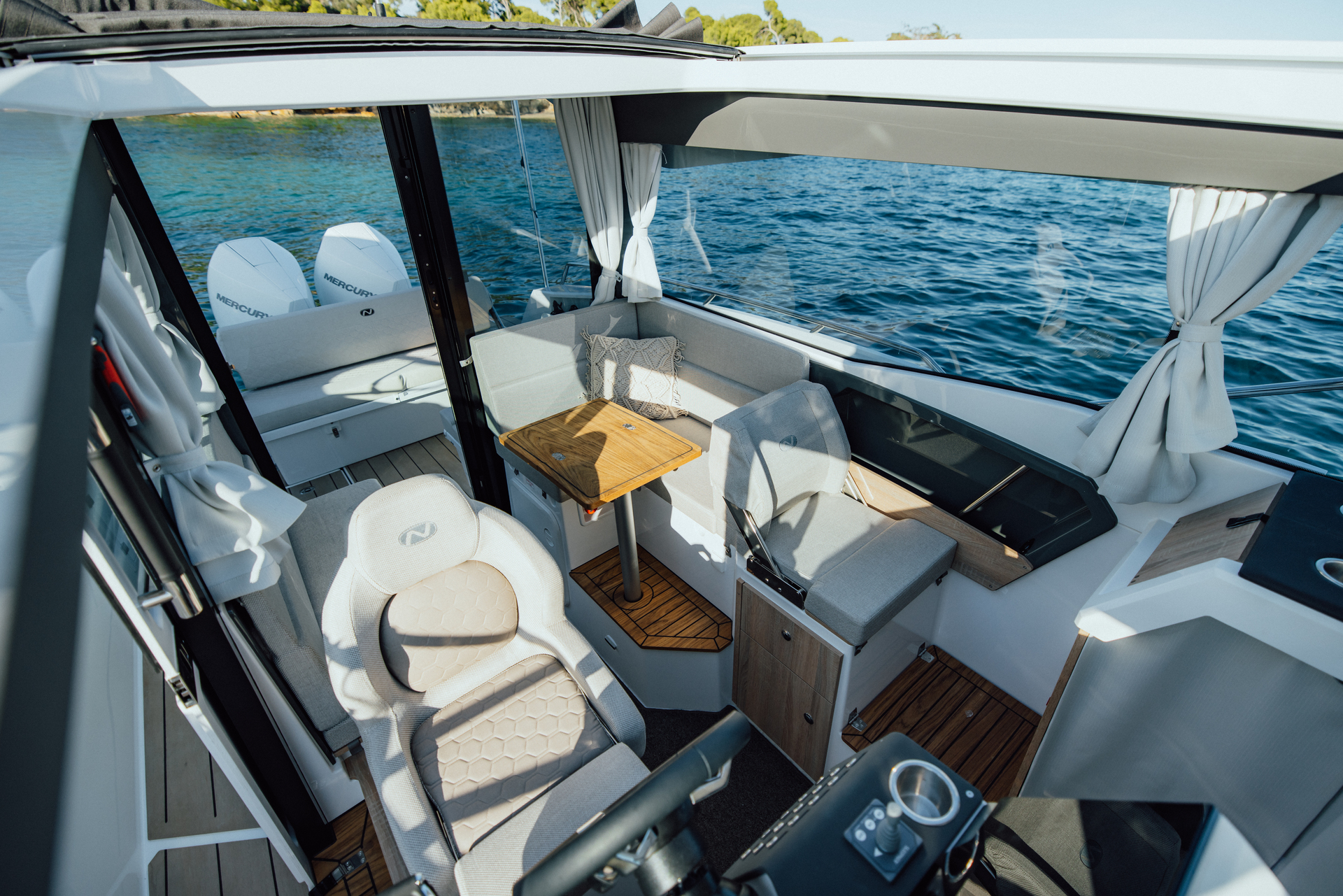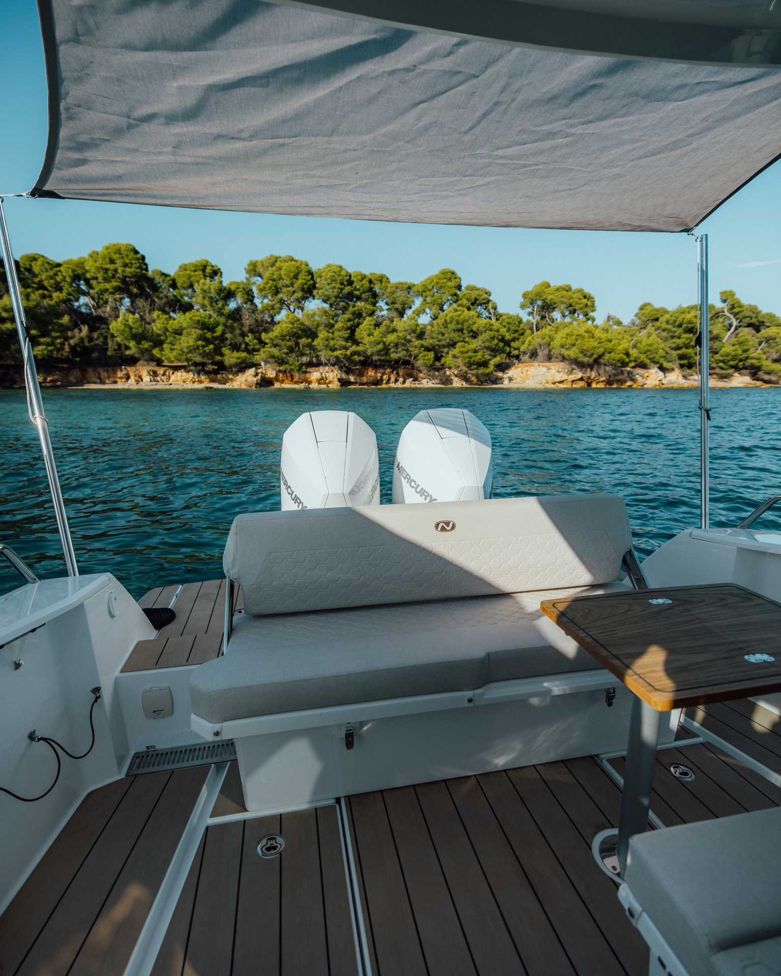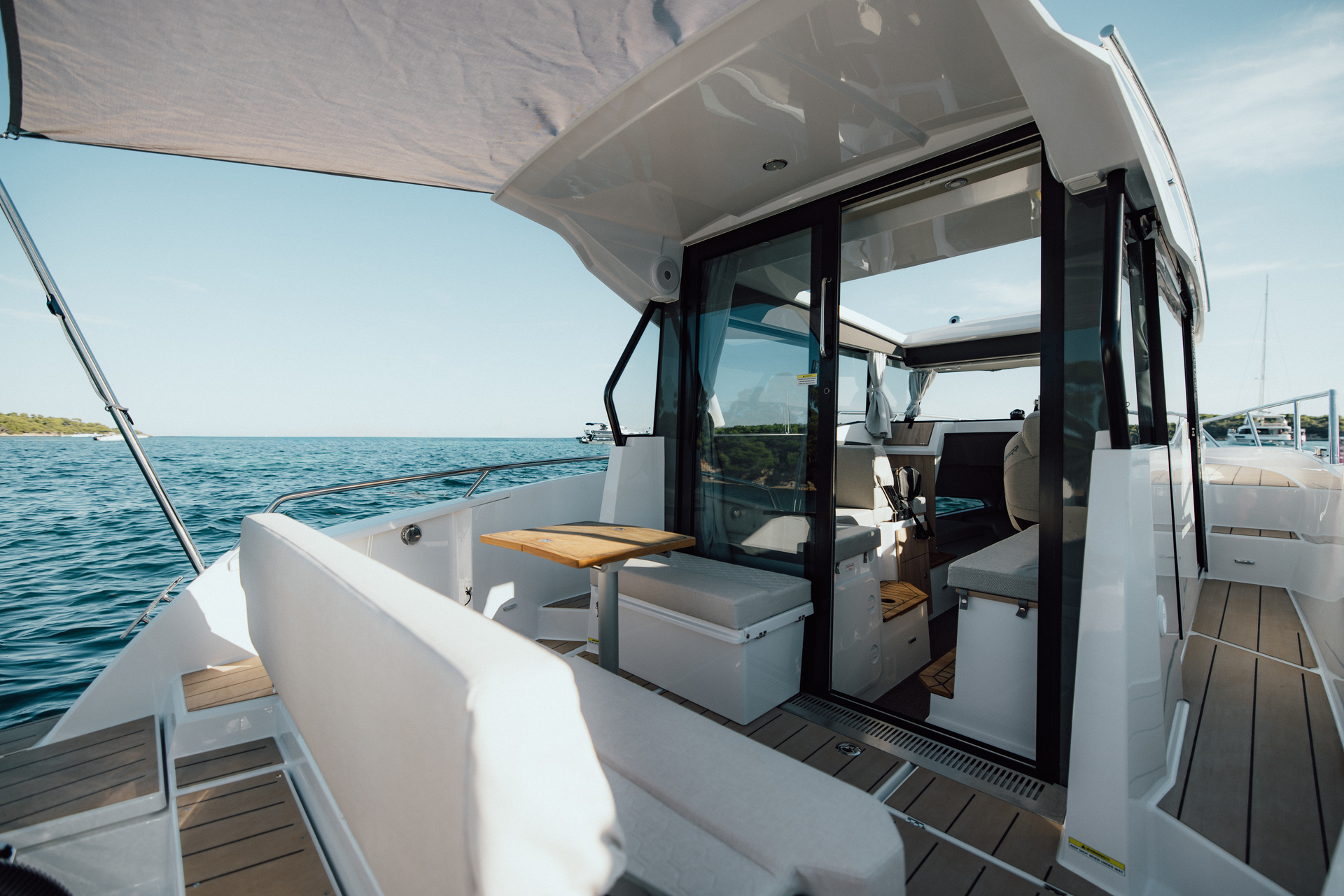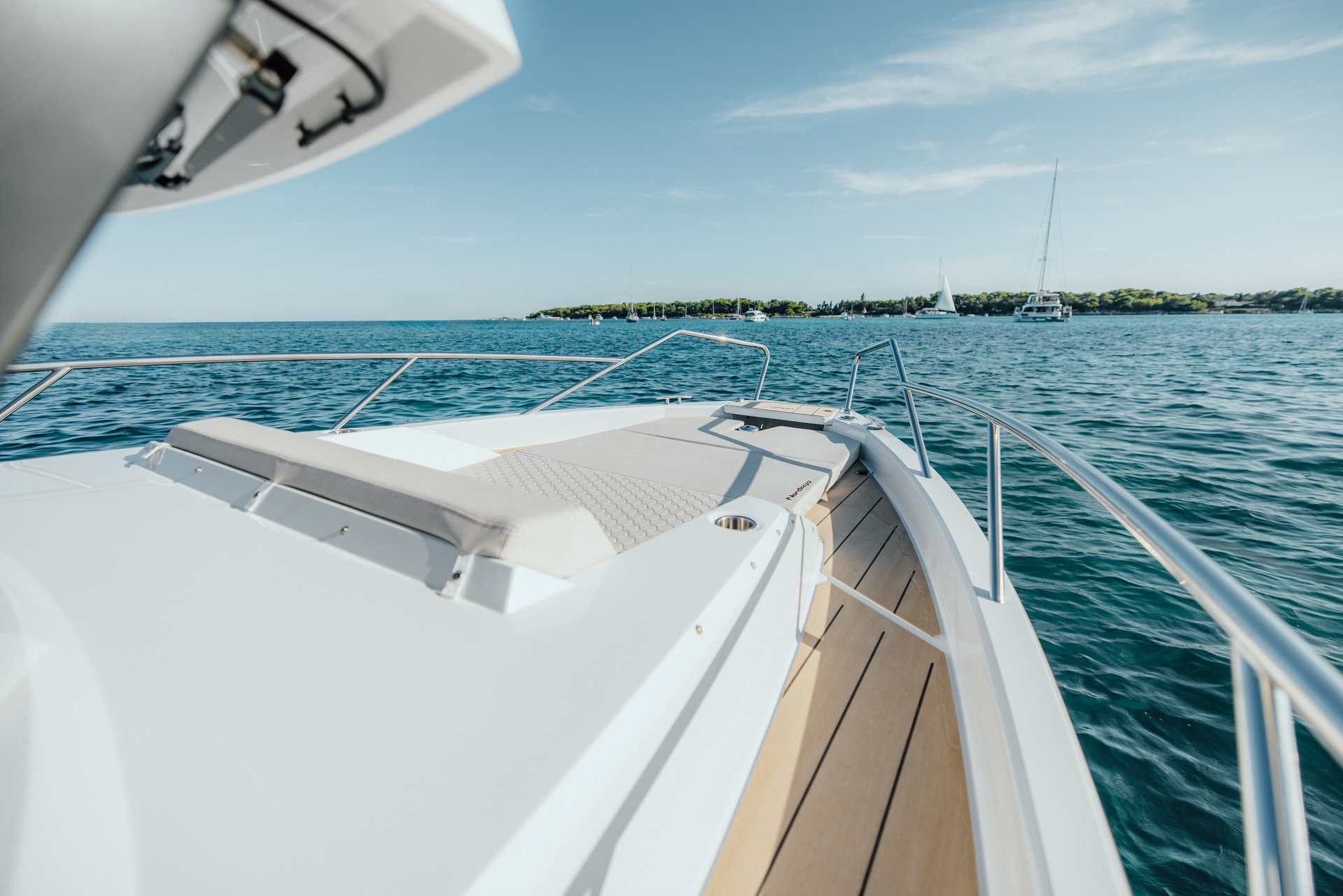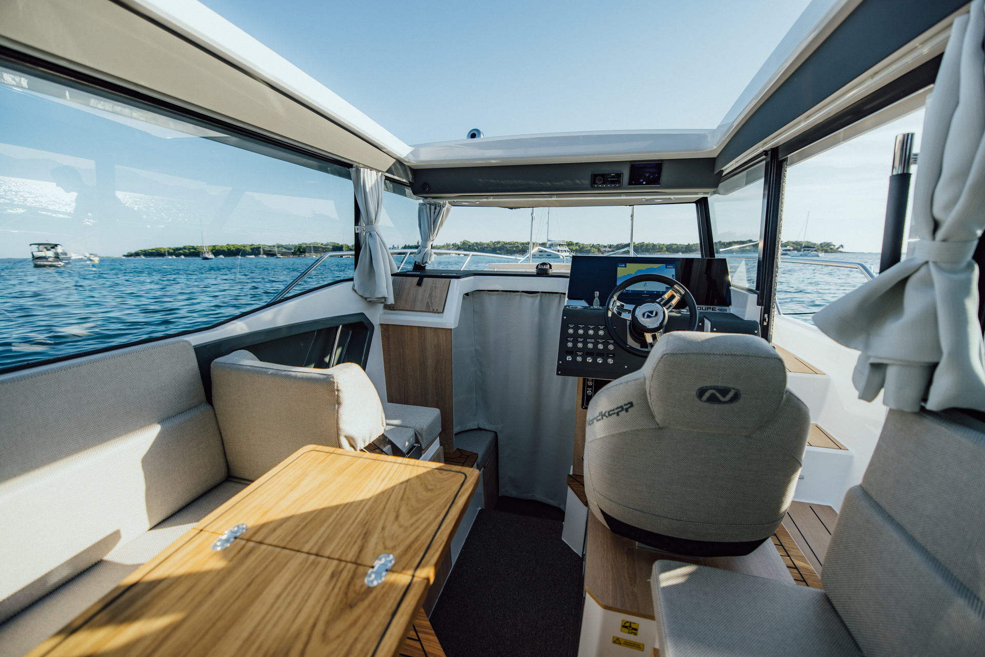 Premium materials—tempered-glass windscreen, stainless fittings, S‑Deck soft floor, refined joinery, hydraulic steering—and Scandinavian craftsmanship provide durability, comfort, and timeless elegance