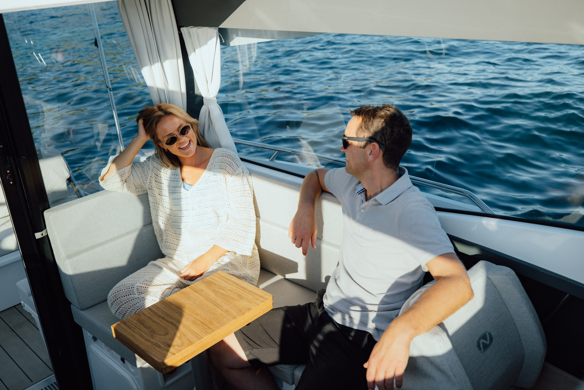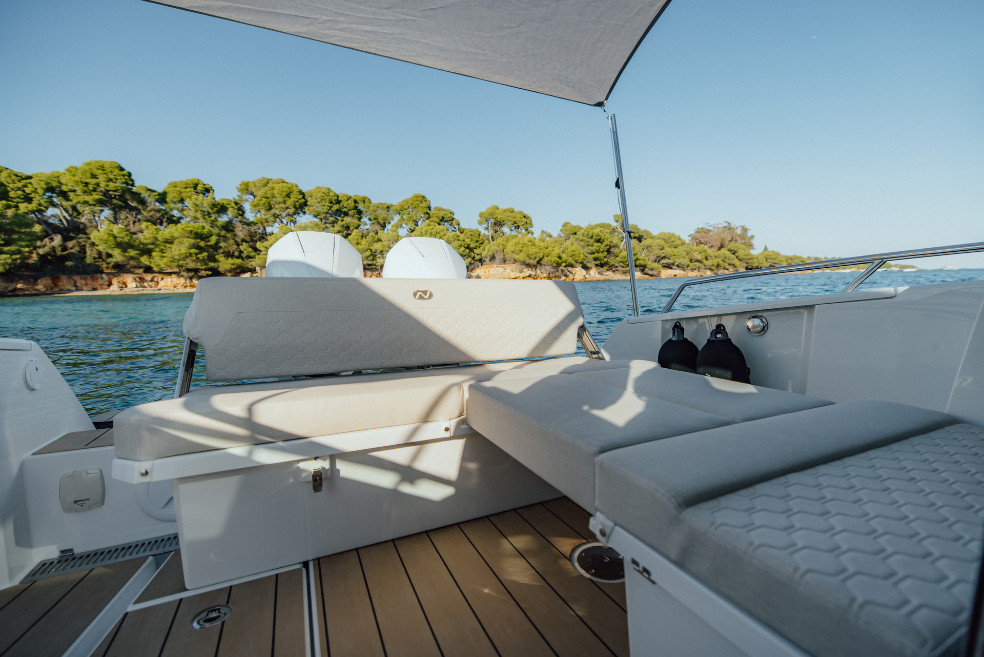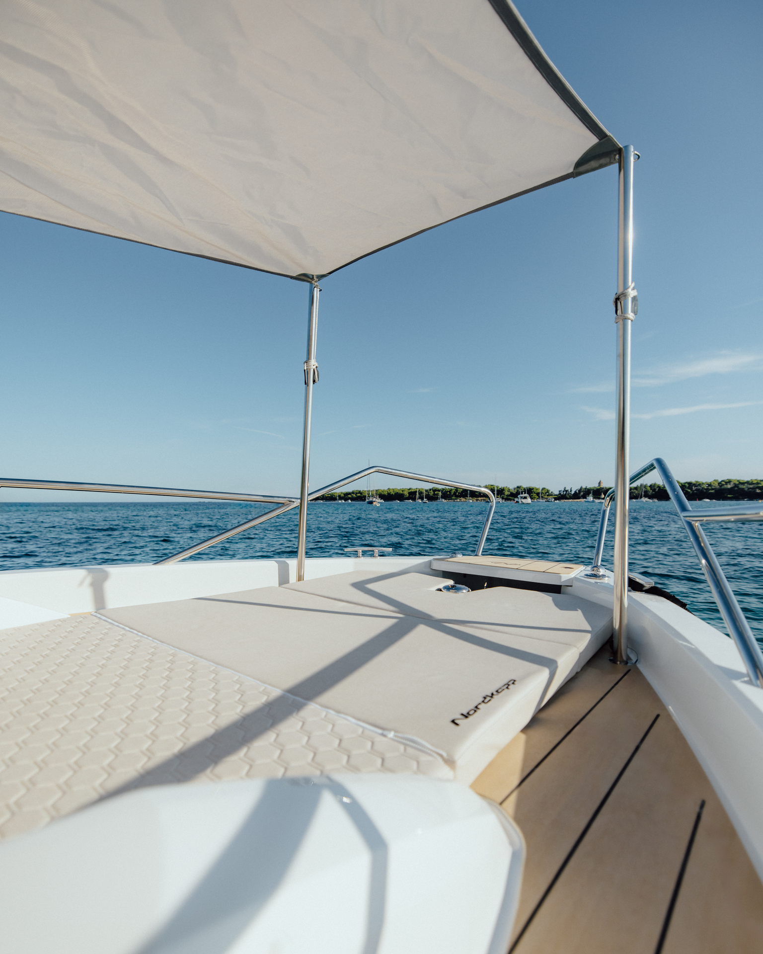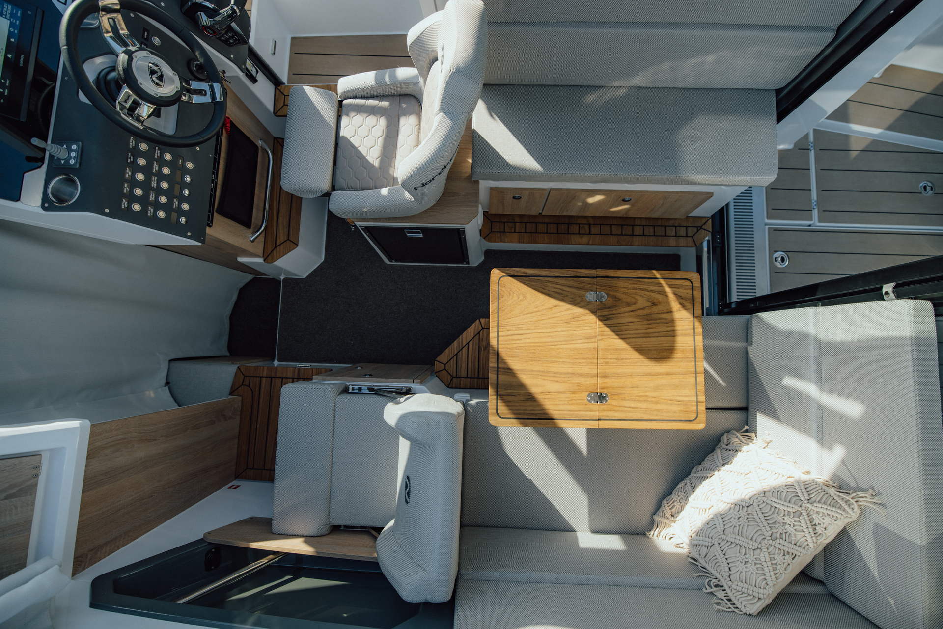 Premium materials—tempered-glass windscreen, stainless fittings, S‑Deck soft floor, refined joinery, hydraulic steering—and Scandinavian craftsmanship provide durability, comfort, and timeless elegance