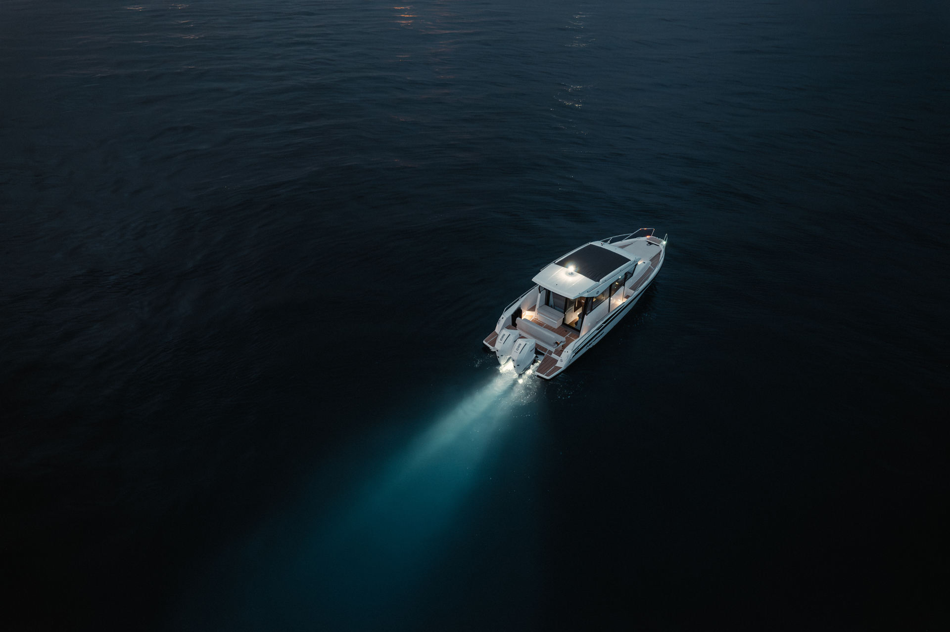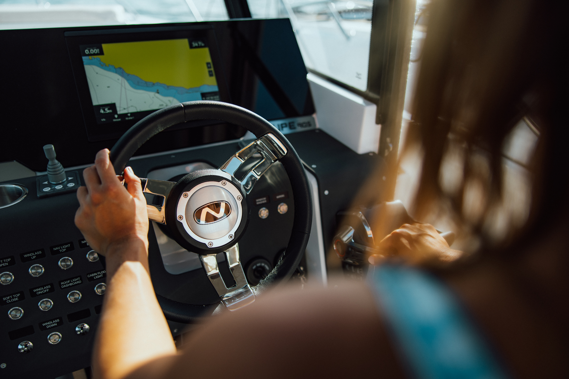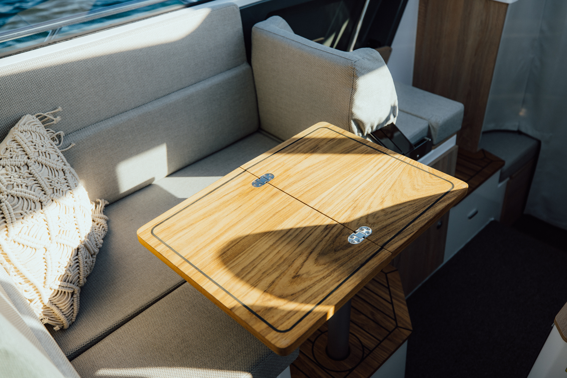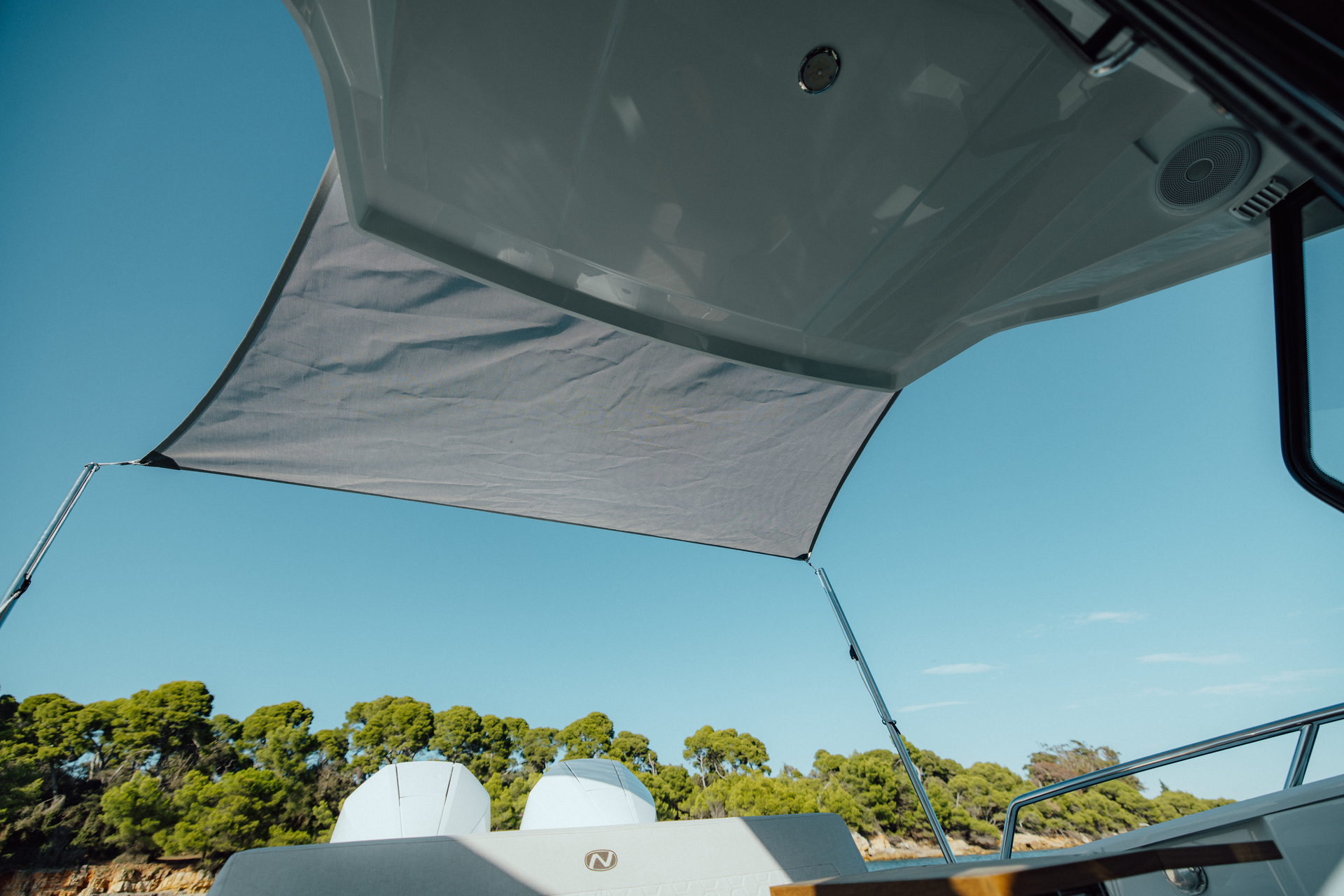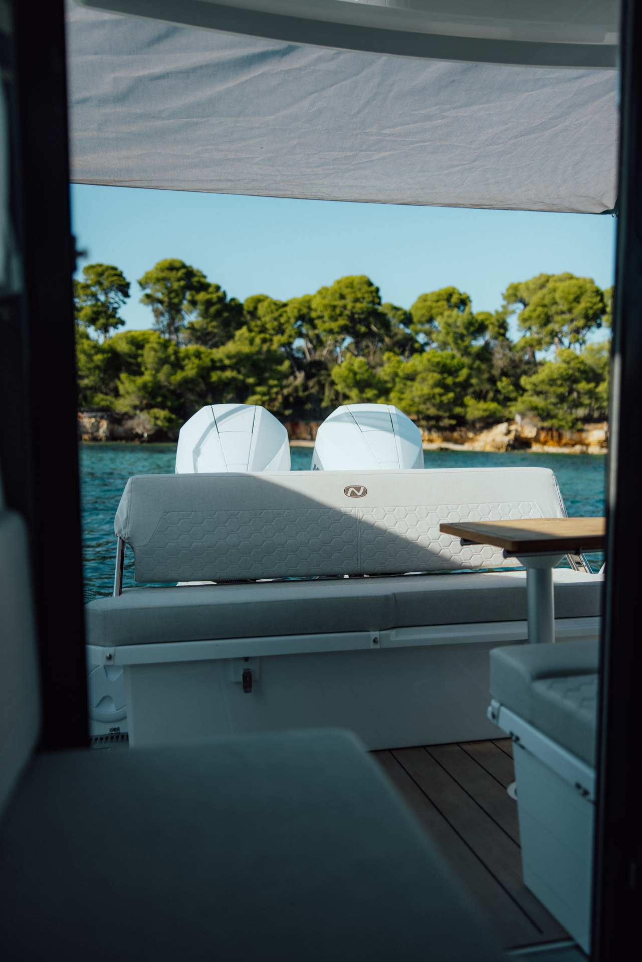 Premium materials—tempered-glass windscreen, stainless fittings, S‑Deck soft floor, refined joinery, hydraulic steering—and Scandinavian craftsmanship provide durability, comfort, and timeless elegance