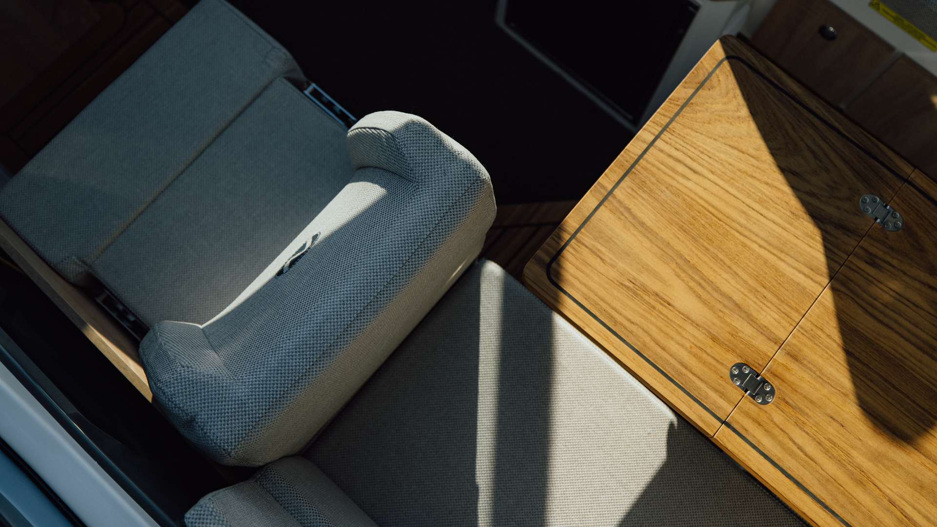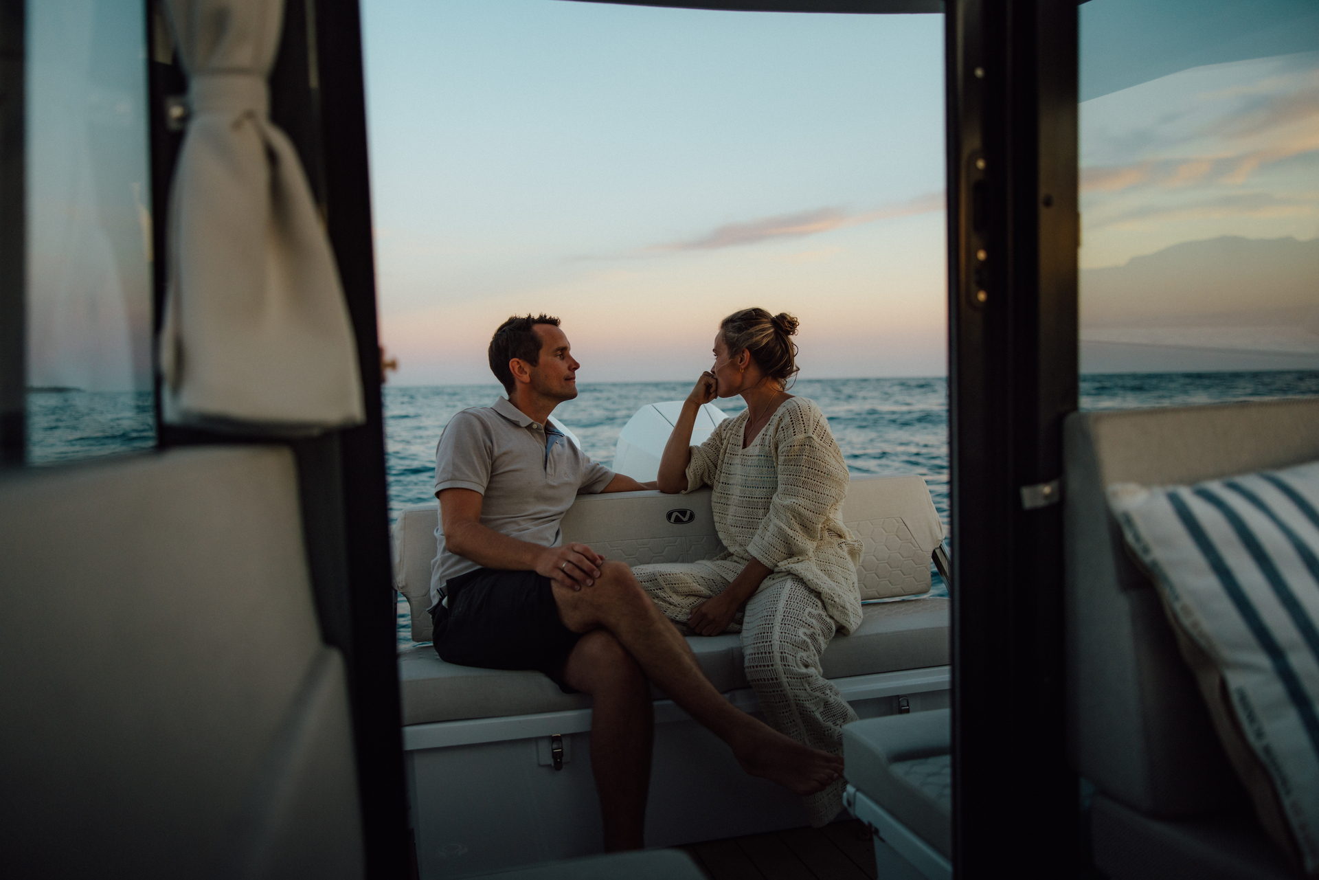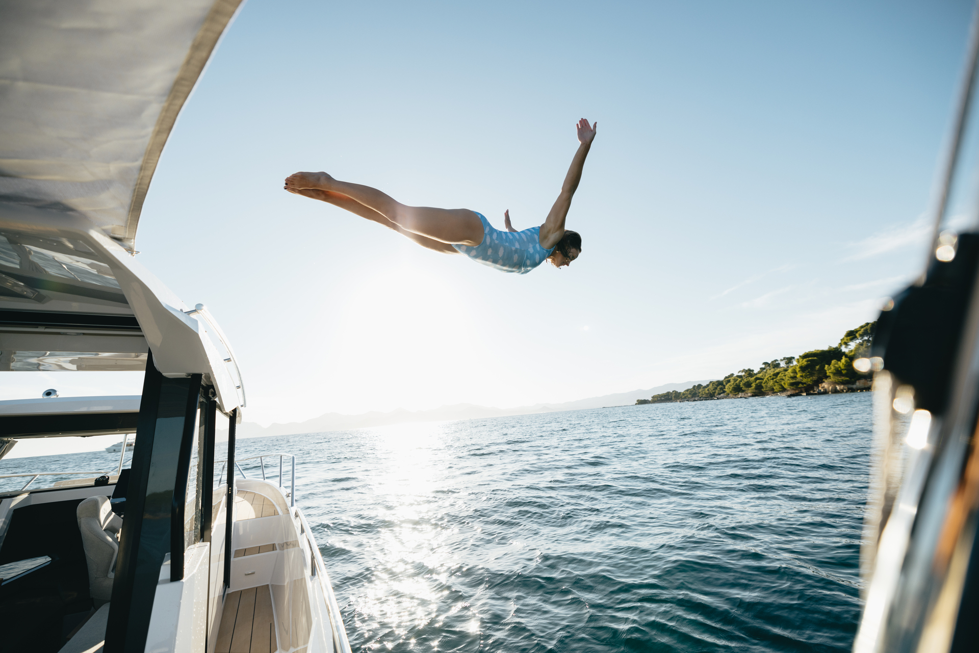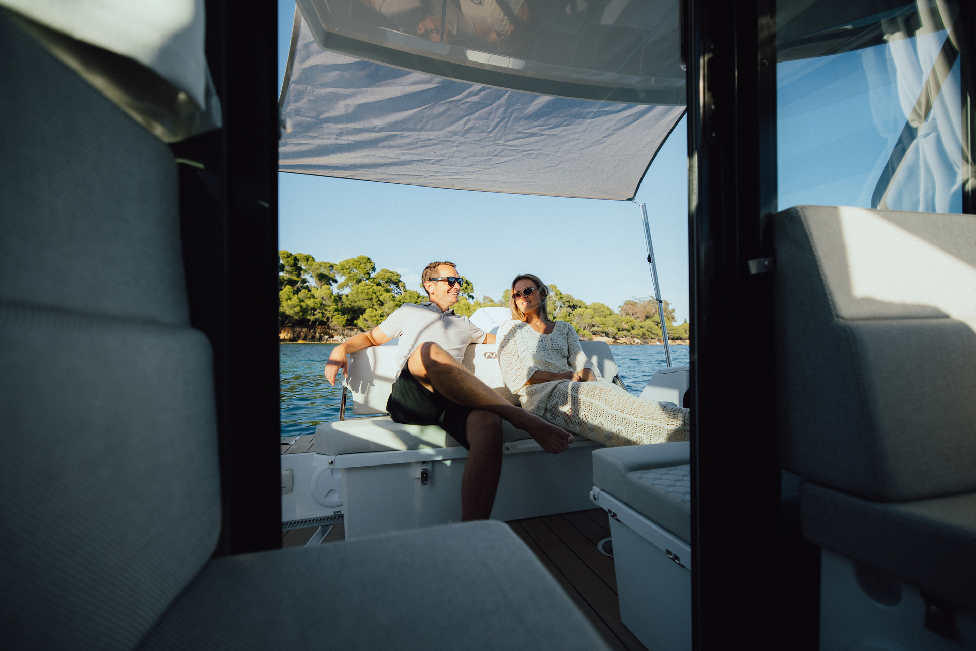 Premium materials—tempered-glass windscreen, stainless fittings, S‑Deck soft floor, refined joinery, hydraulic steering—and Scandinavian craftsmanship provide durability, comfort, and timeless elegance