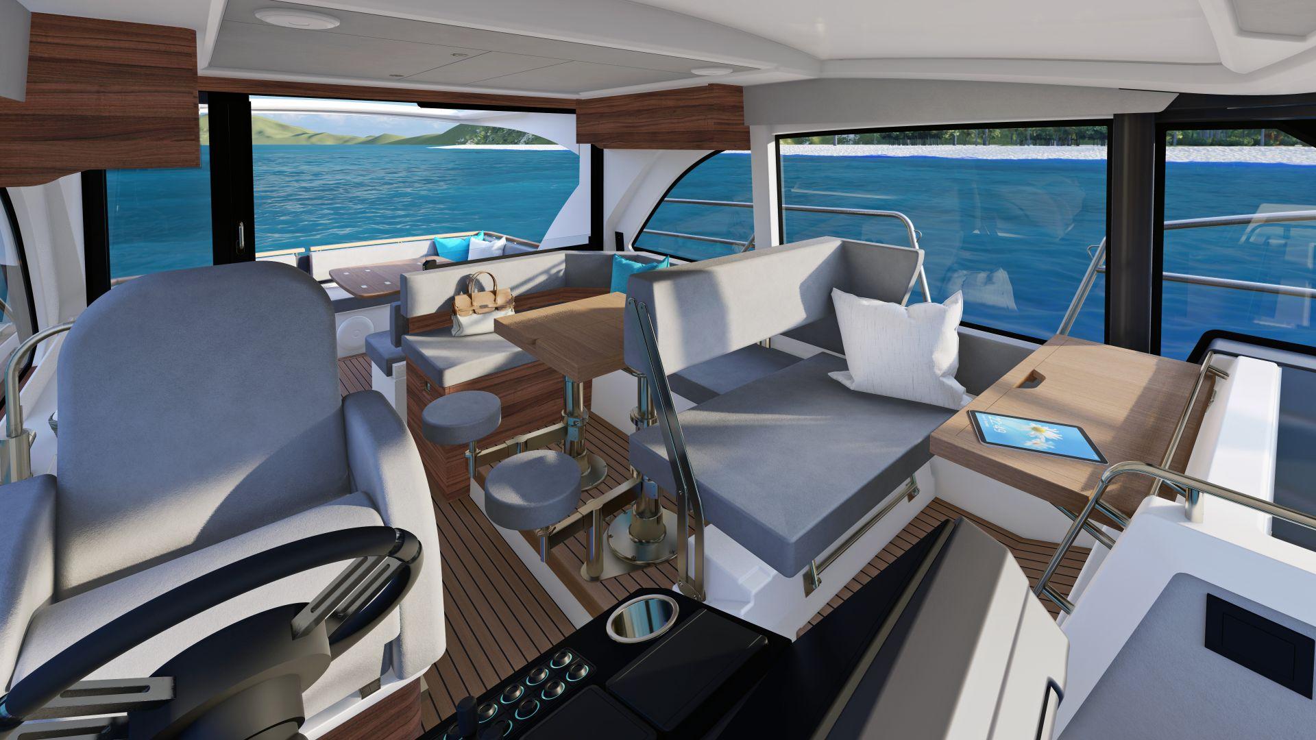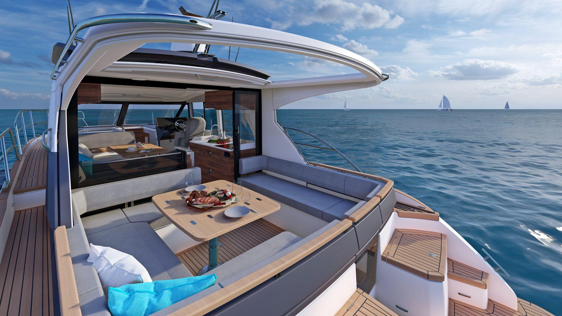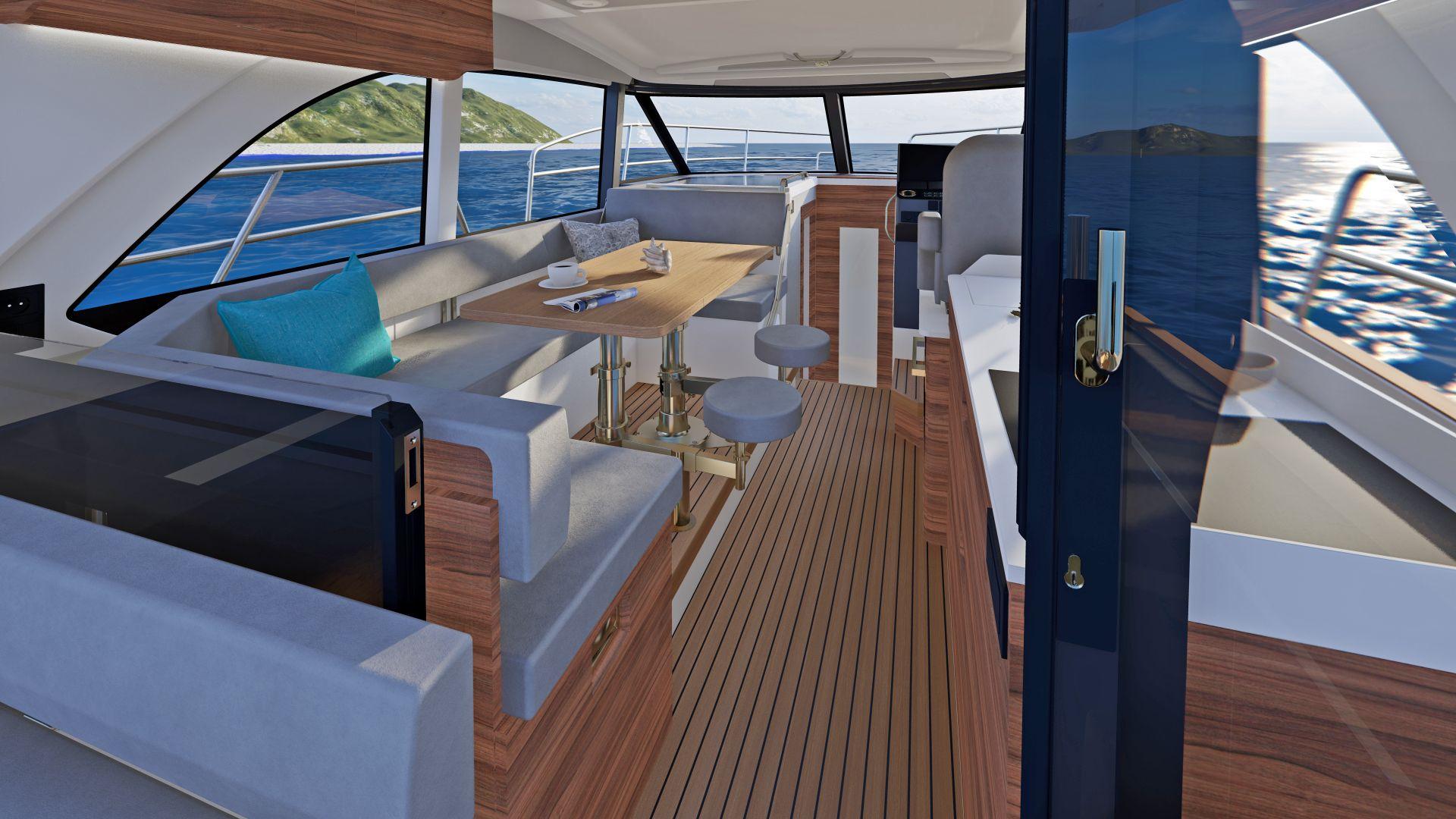 U-shaped cockpit sofa for eight with extendable seating, transparent transom gate, walk-around decks and foredeck sunpad offer generous entertainment areas