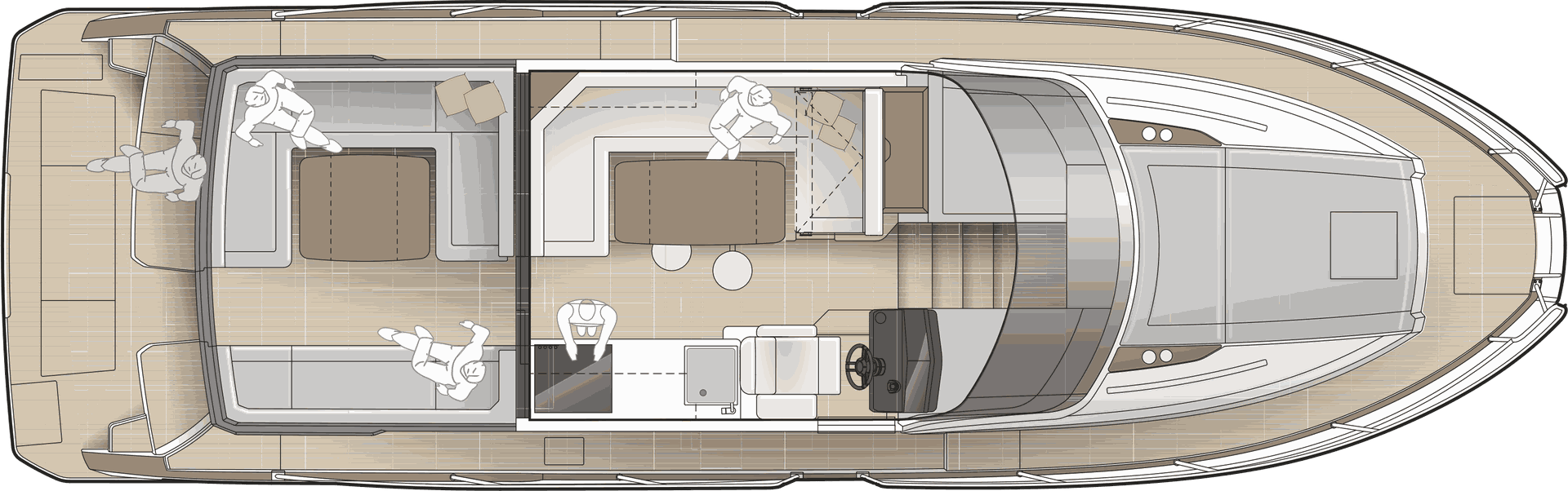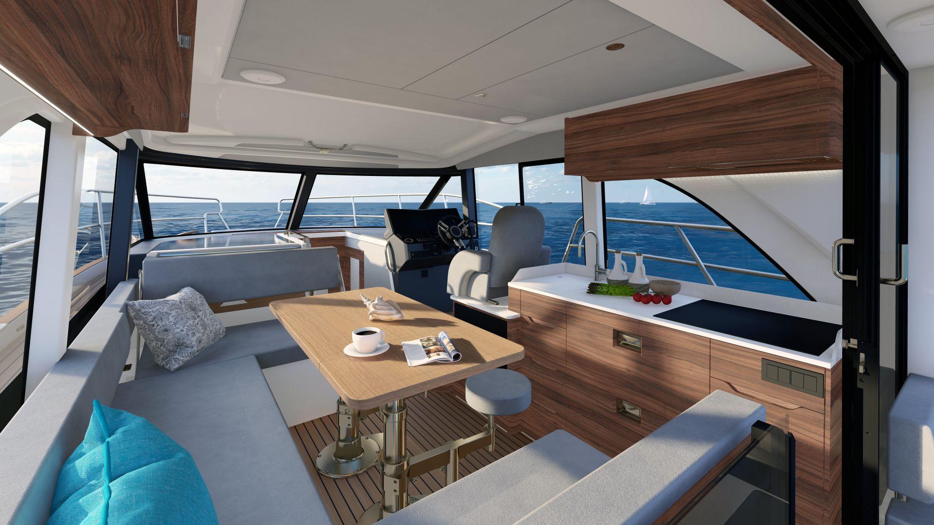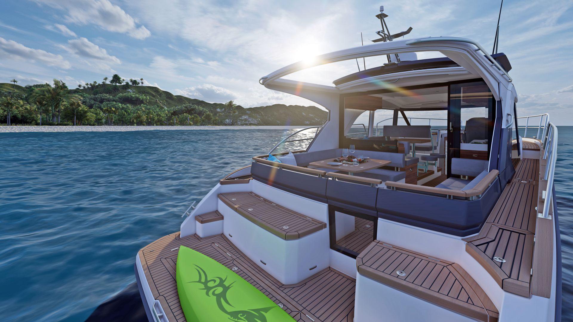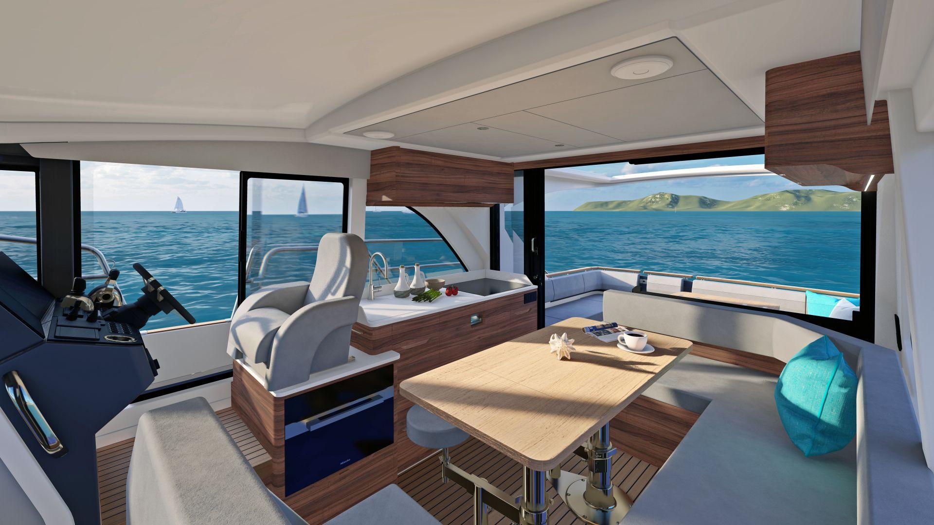 U-shaped cockpit sofa for eight with extendable seating, transparent transom gate, walk-around decks and foredeck sunpad offer generous entertainment areas