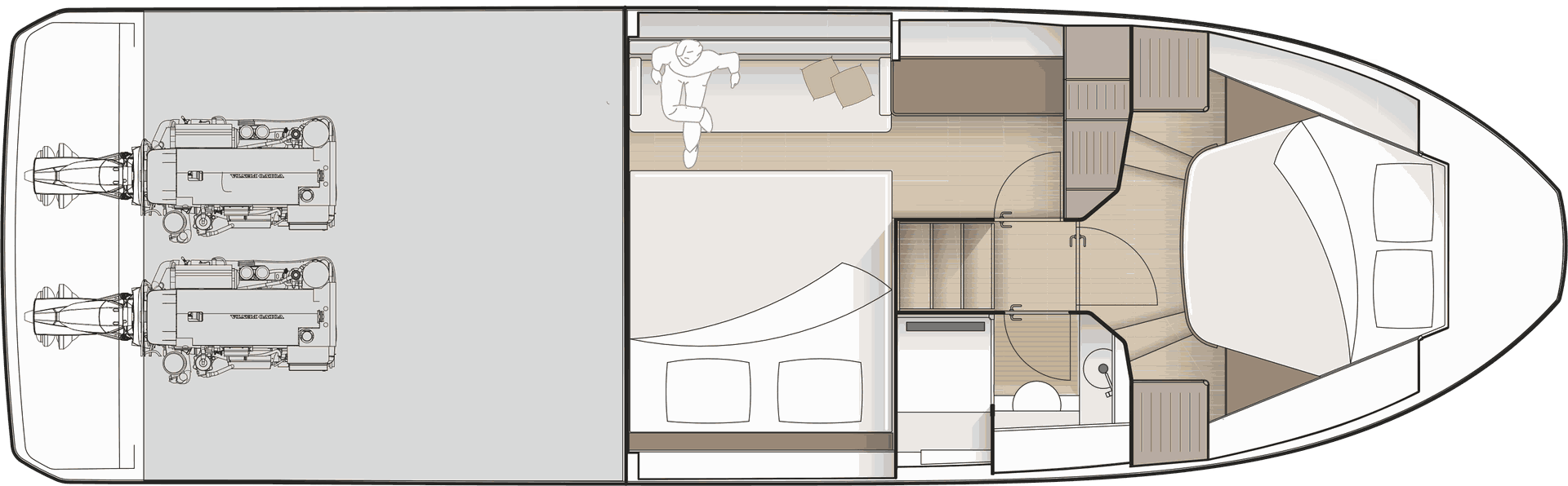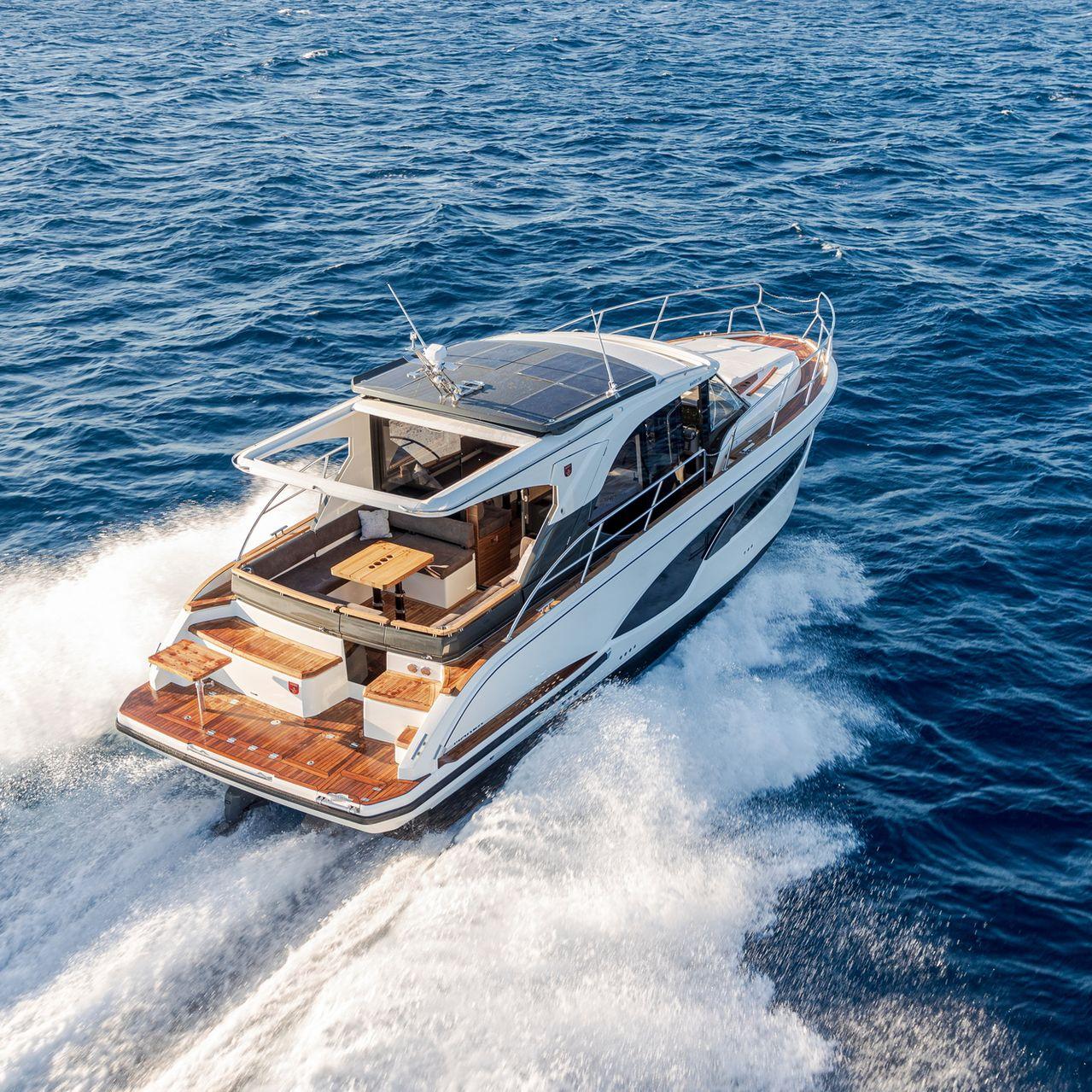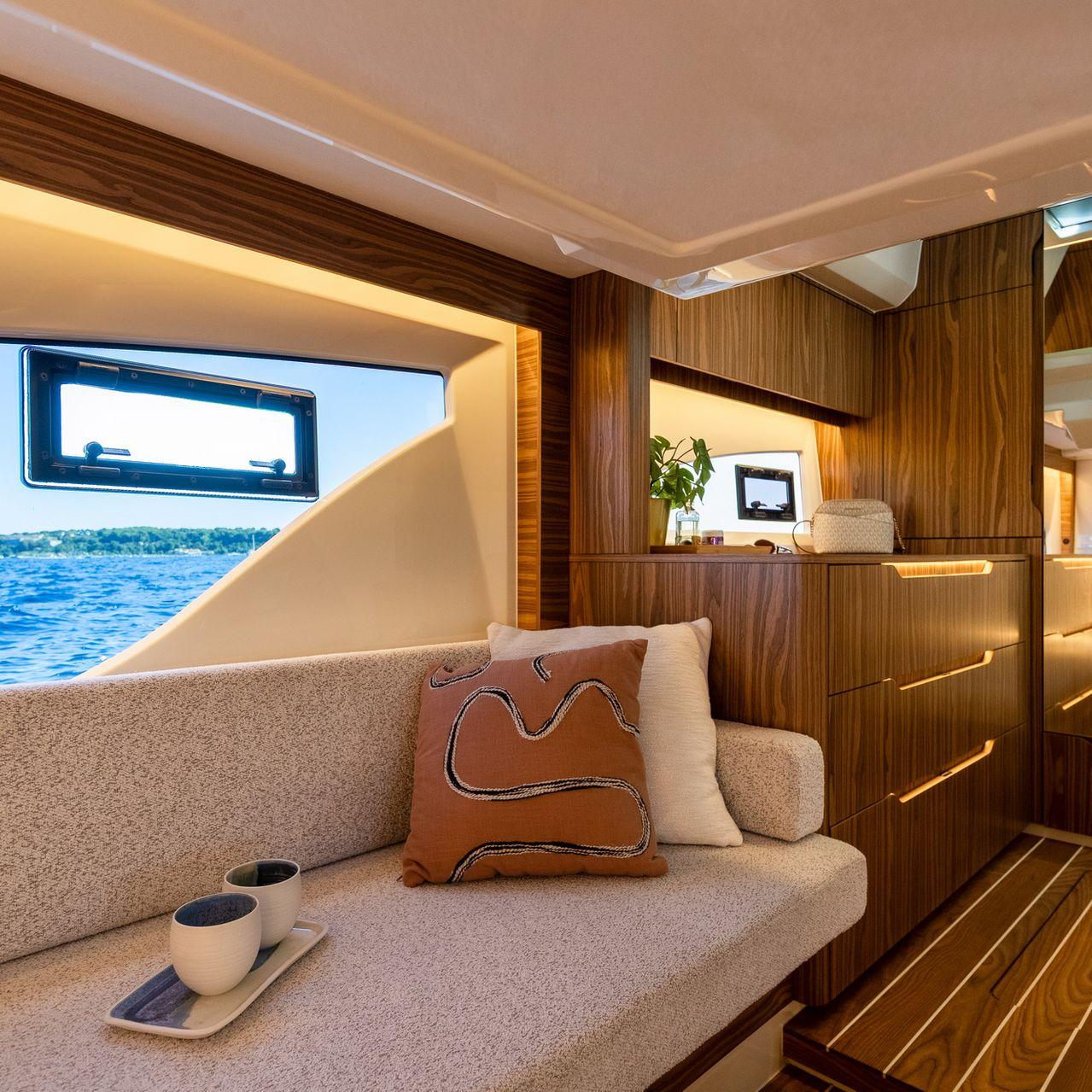 Available with twin Volvo Penta D4-320 or D6‑440 sterndrive, or shaft drive—offering thrilling performance and excellent cruising range
