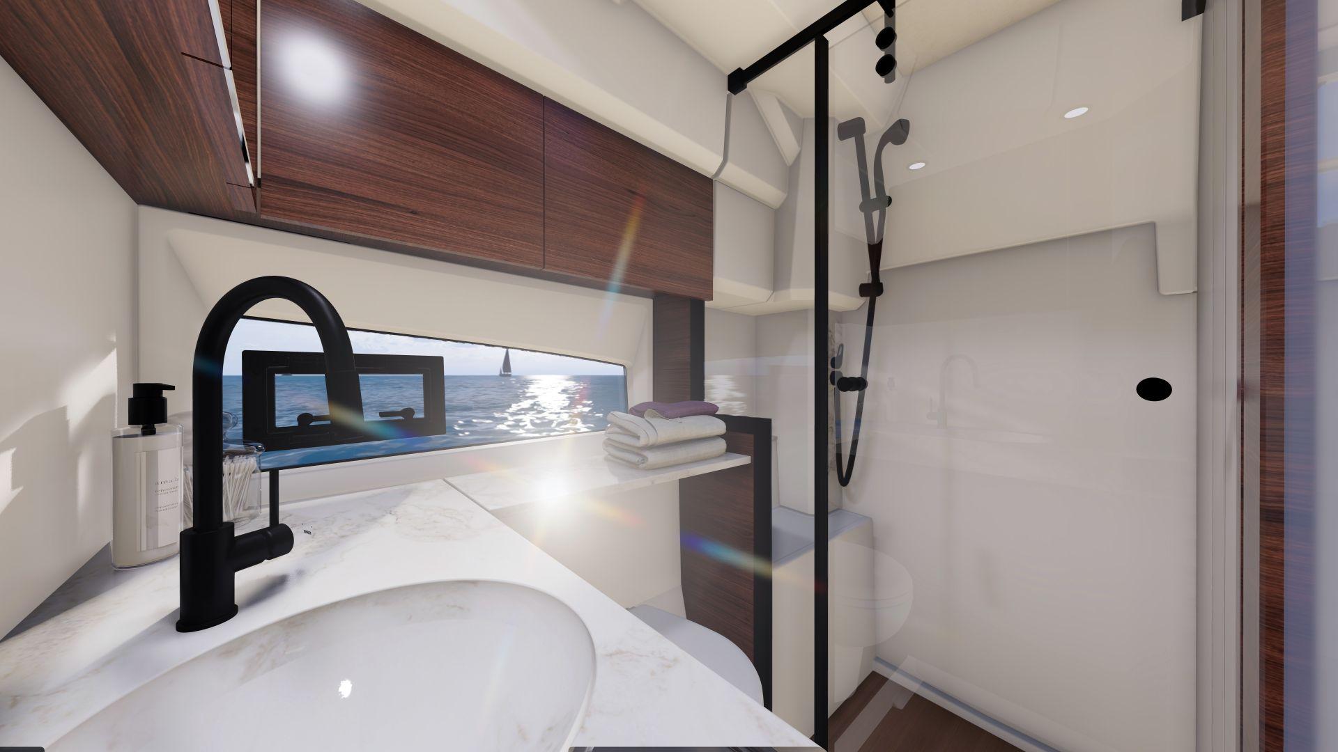 A large bathroom with separate shower cubicle, electric toilet and vanity delivers true cruising comfort at this size