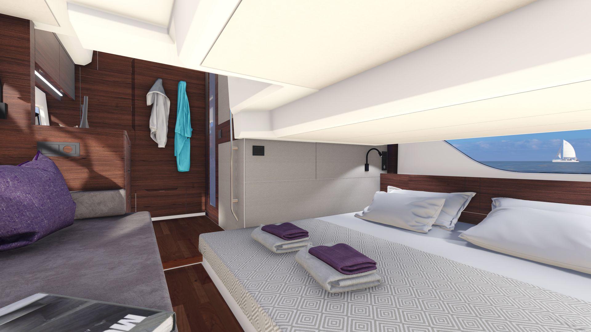 Comfortable forward master and midship guest cabins both with full doubles, large windows, storage and sitting/dinette conversion in the aft cabin