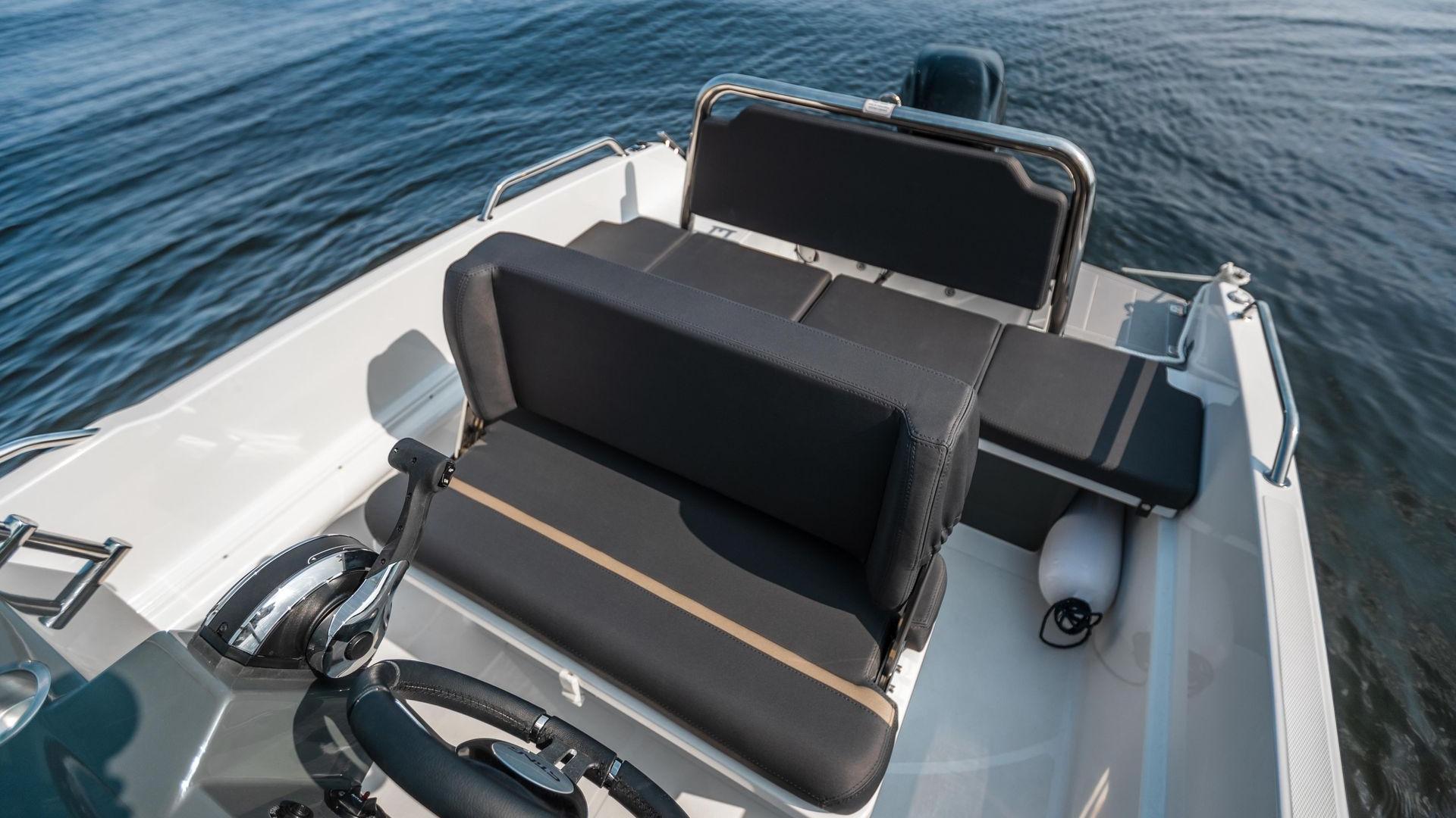 The back of the bench seat by the console can be moved towards the bow and stern, so that you can sit facing the stern bench when the boat is stationary and you have passengers. The aft bench is wide and comfortable with backrest for 2 people.