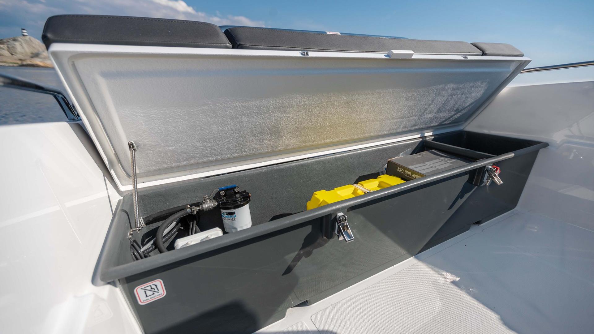 High rows follow the hull side throughout the bow section and increase the perceived height of the freeboard. The console is placed somewhat to starboard, and has plenty of room for passage on the port side, as well as allowing you to pass on an elevated level on the starboard side. In front of the console you will find space for 4 fenders, and you get a neat and practical place to keep these when they are not in use.