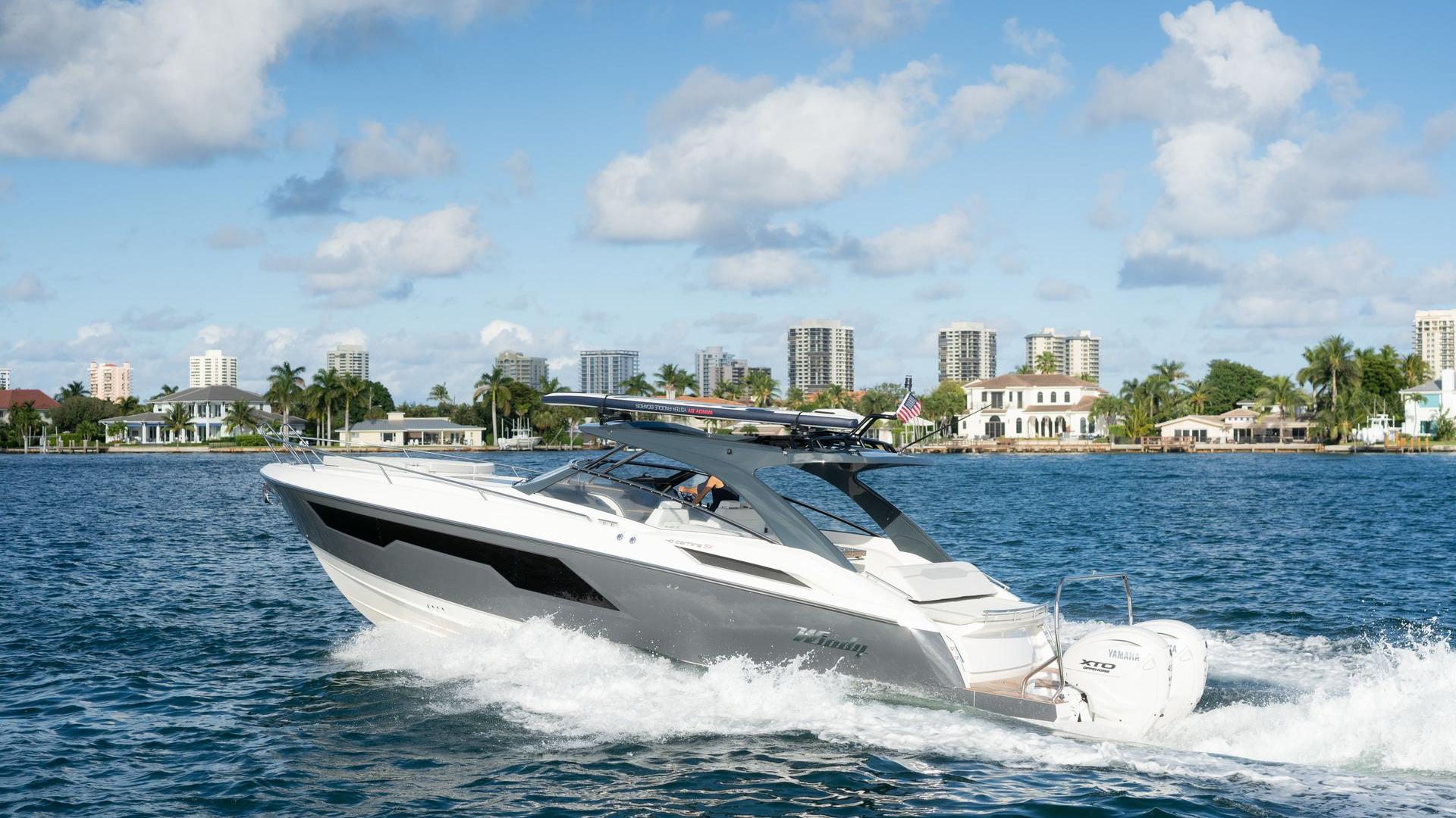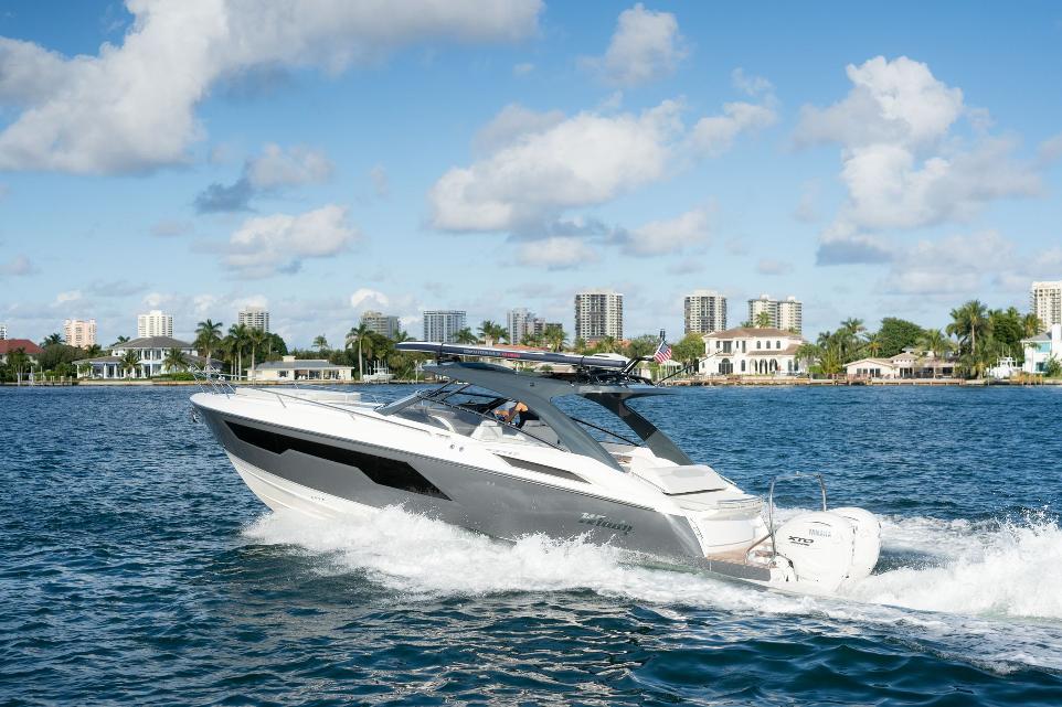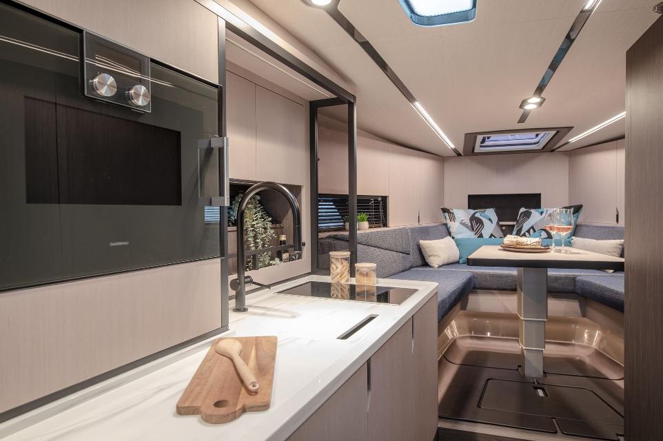 Beneath the aft sun pads is a sizable garage for the stowage of water toys, and the Camira’s cockpit table converts from dining setup to extended cushioned seating with ease.